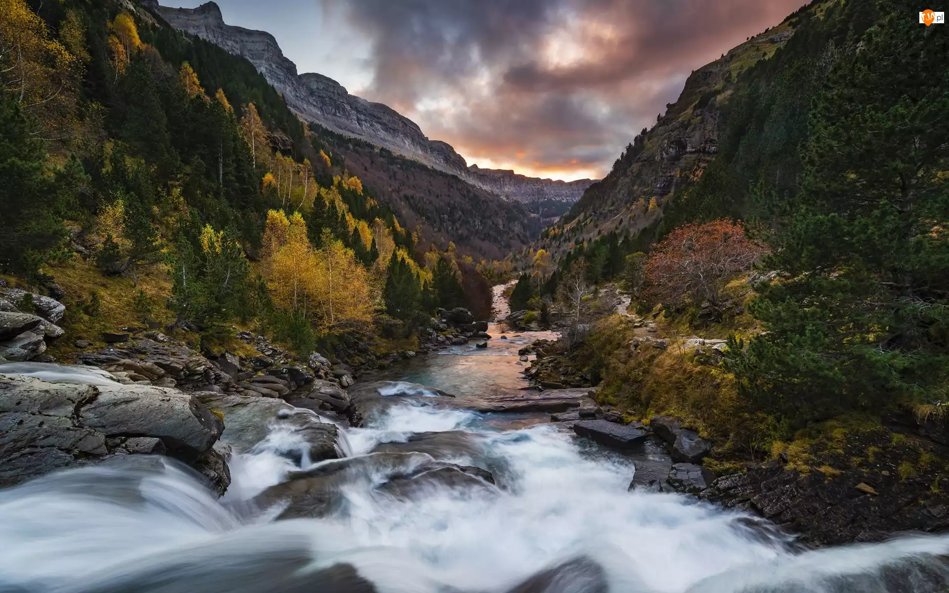 Pireneje, Góry, Drzewa, Park Narodowy de Ordesa y Monte Perdido, Rzeka, Lasy, Hiszpania, Kamienie