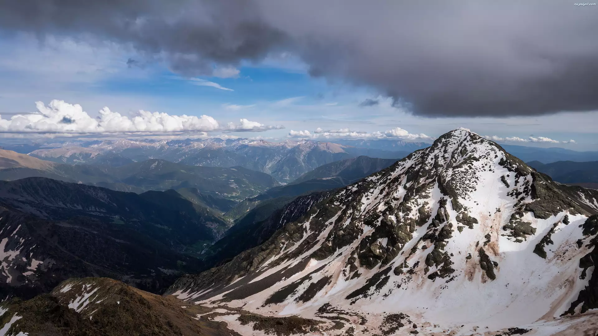 Śnieg, Andora, Szczyt, Niebo, Góry, Coma Pedrosa, Chmury, Pireneje wschodnie