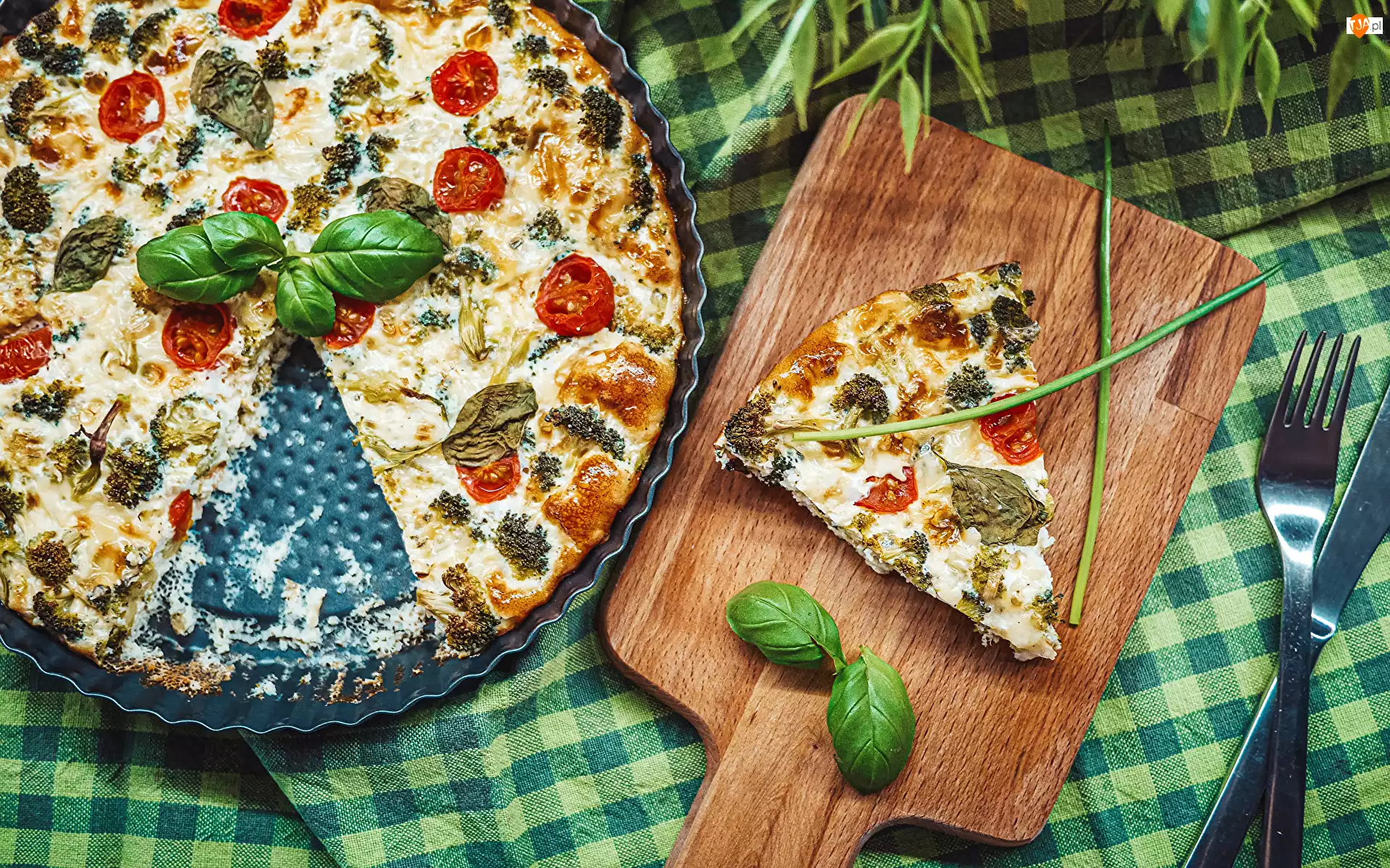 Liście, Pizza, Nóż, Bazylia, Taca, Deska, Pomidorki Cherry, Widelec