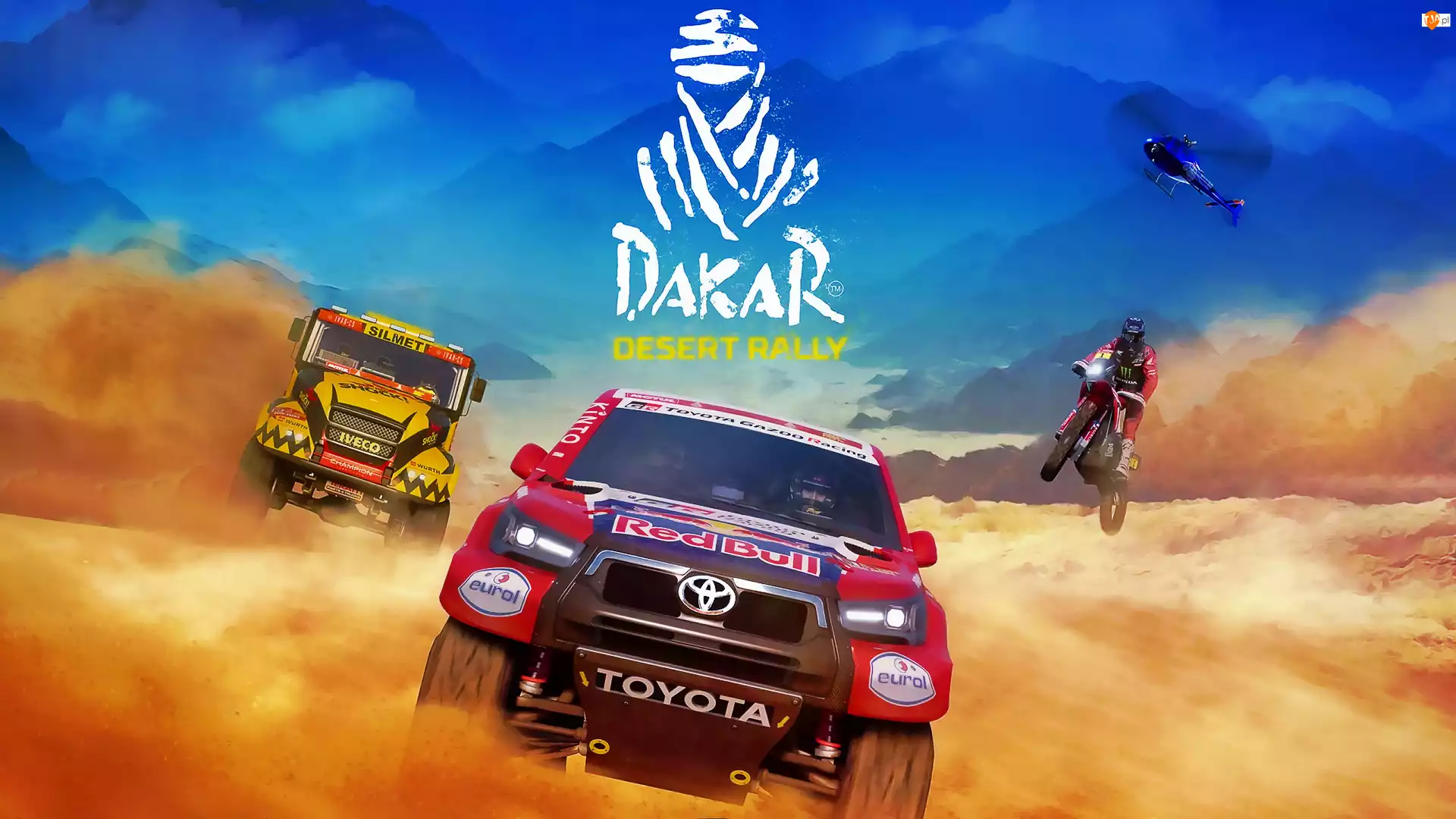 Plakat, Dakar Desert Rally, Pustynia, Motocykl, Helikopter, Samochody, Iveco, Gra, Toyota