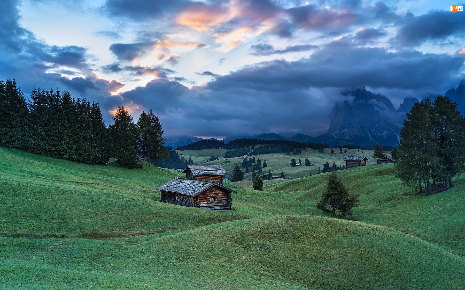Płaskowyż Seiser Alm, Val Gardena, Domy, Drzewa, Góry, Chmury, Dolina, Dolomity, Drewniane, Sassolungo, Włochy