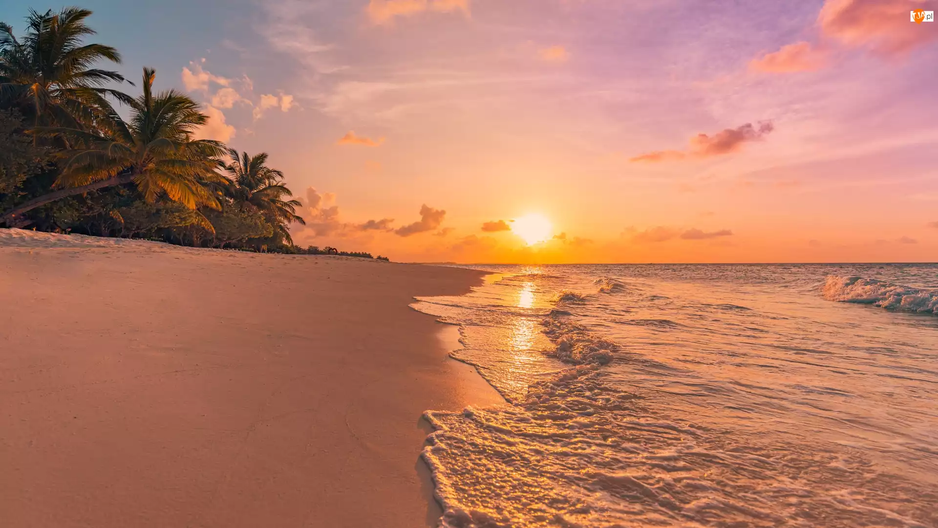 Plaża, Palmy, Morze, Malediwy, Zachód słońca