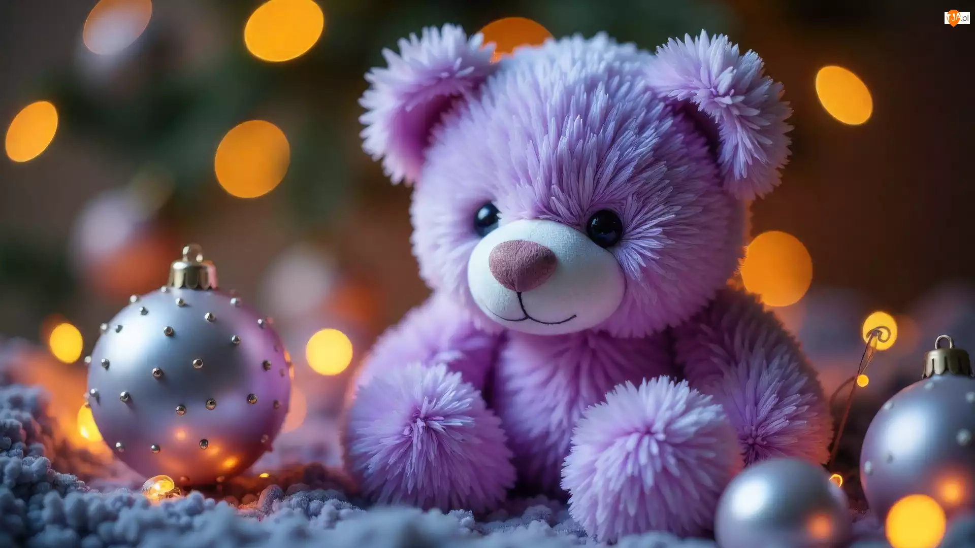 Pluszowy, Grafika AI, Liliowy, Bombki, Miś