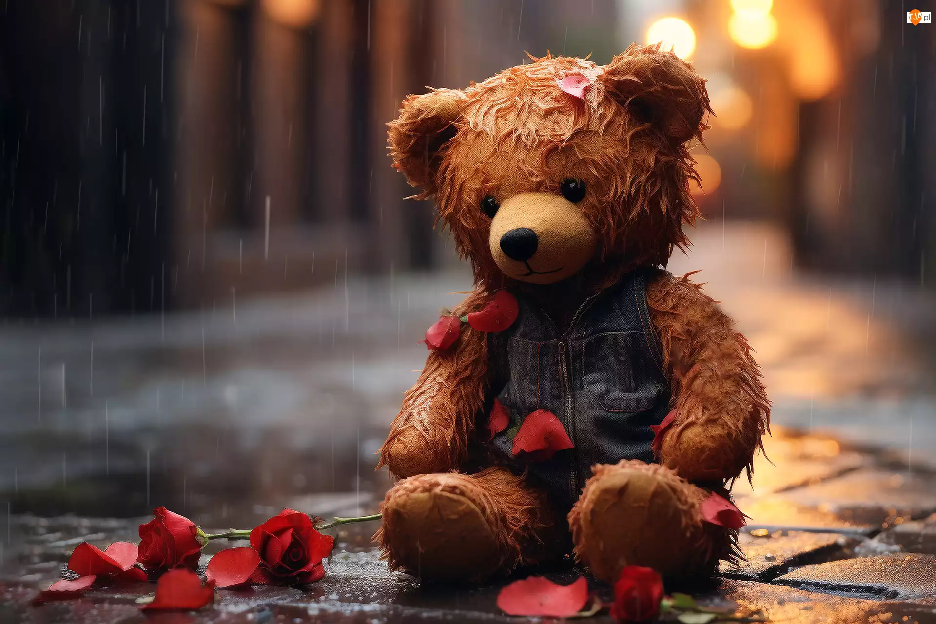 Pluszowy, Mokry, Róże, Ulica, Miś, Deszcz