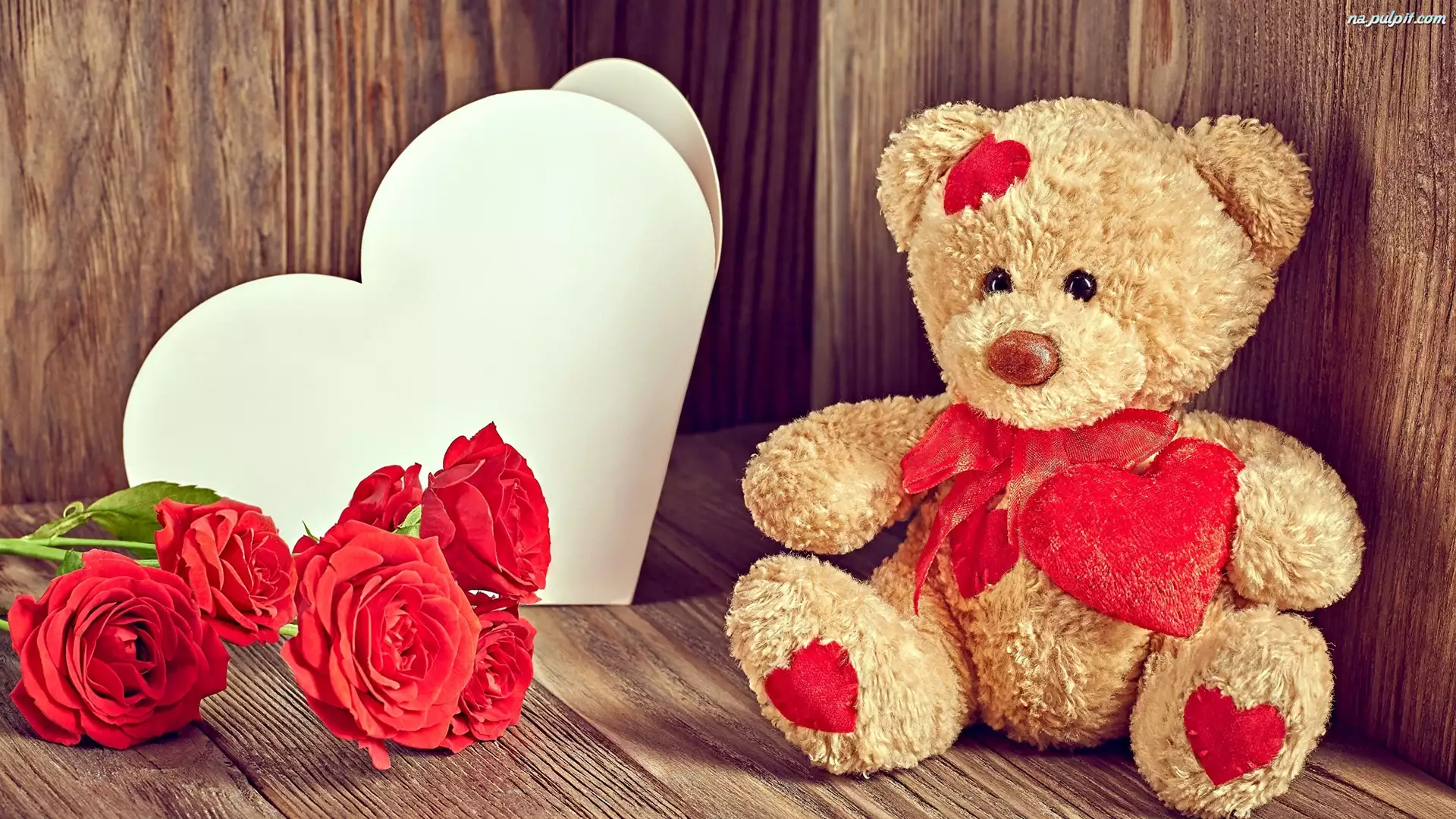 Pluszowy miś obok róż i serca z papieru