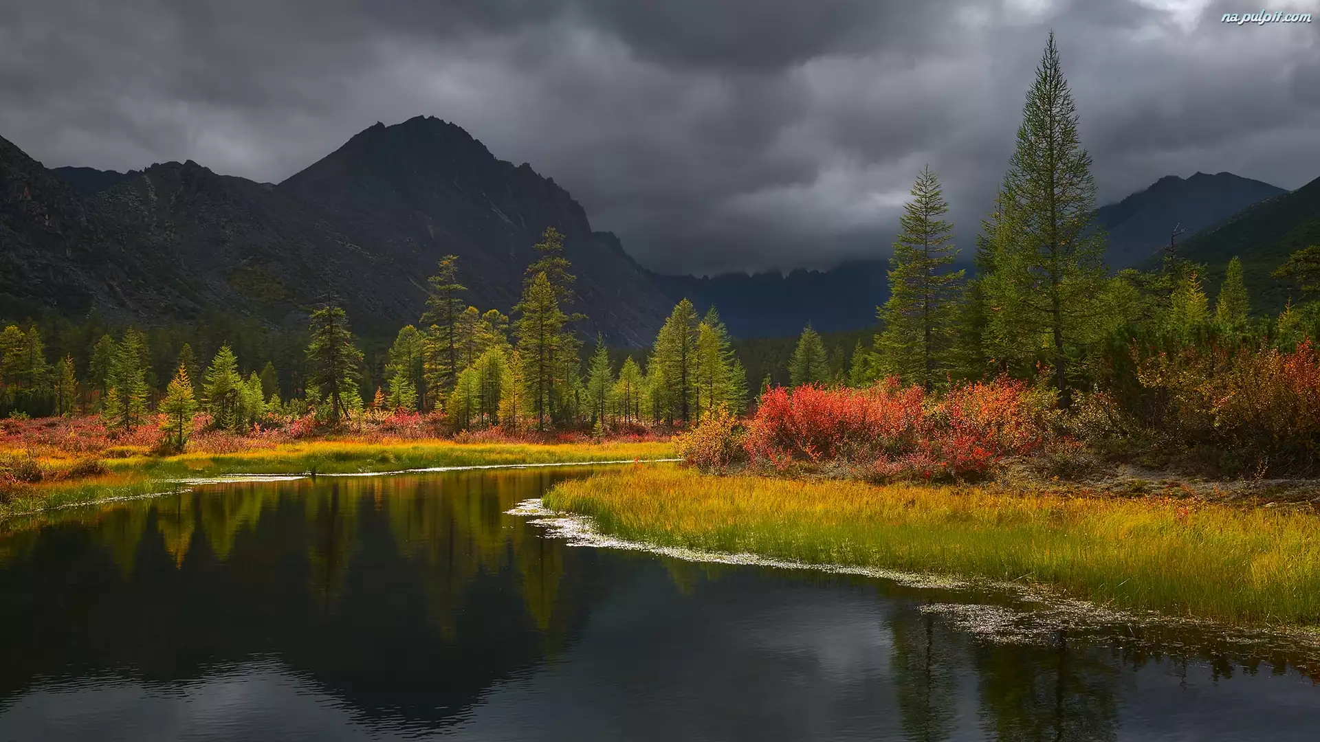 Chmury, Rosja, Jack London, Odbicie, Kołyma, Drzewa, Góry Kołymskie, Jezioro