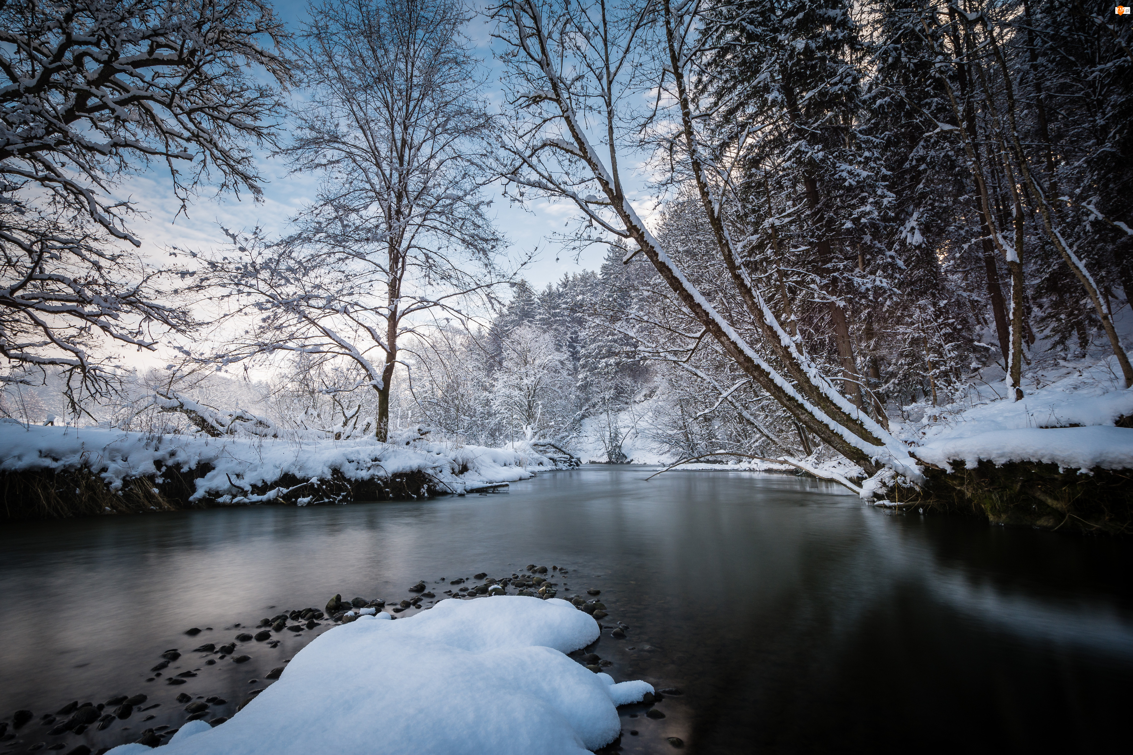 Pochylone, Zima, Las, Rzeka, Drzewa
