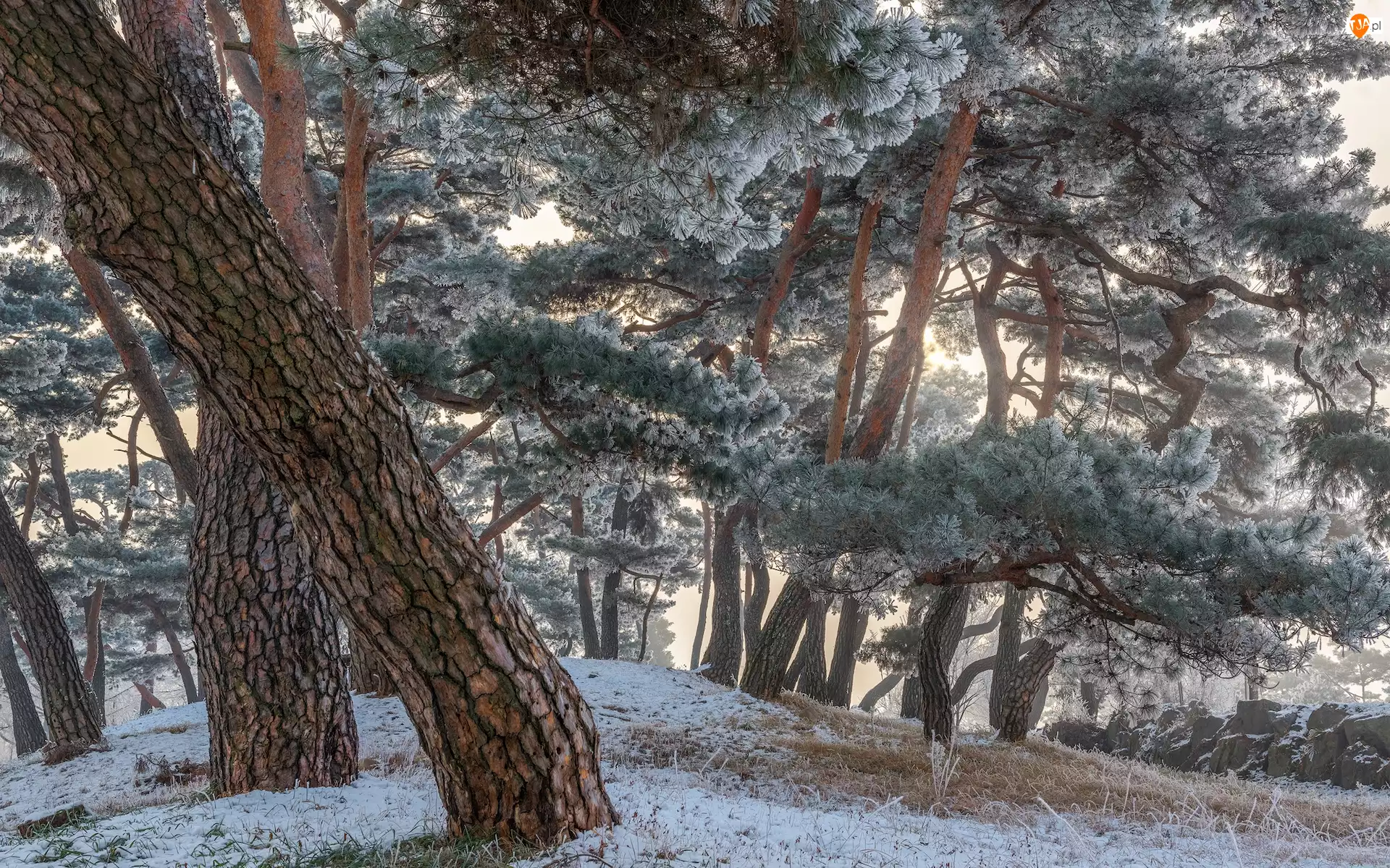 Zima, Pień, Oszronione, Drzewa, Sosny