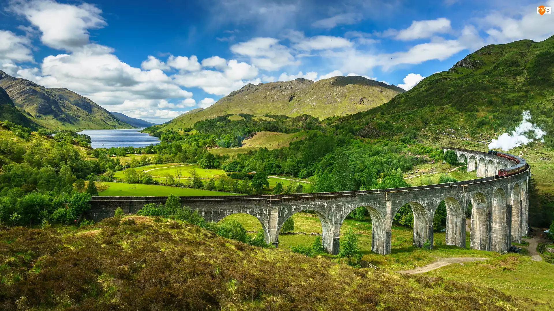 Szkocja, Wiadukt Glenfinnan, Glenfinnan, Wzgórza, Jezioro Shiel, Pociąg, Dolina, Most, Góry