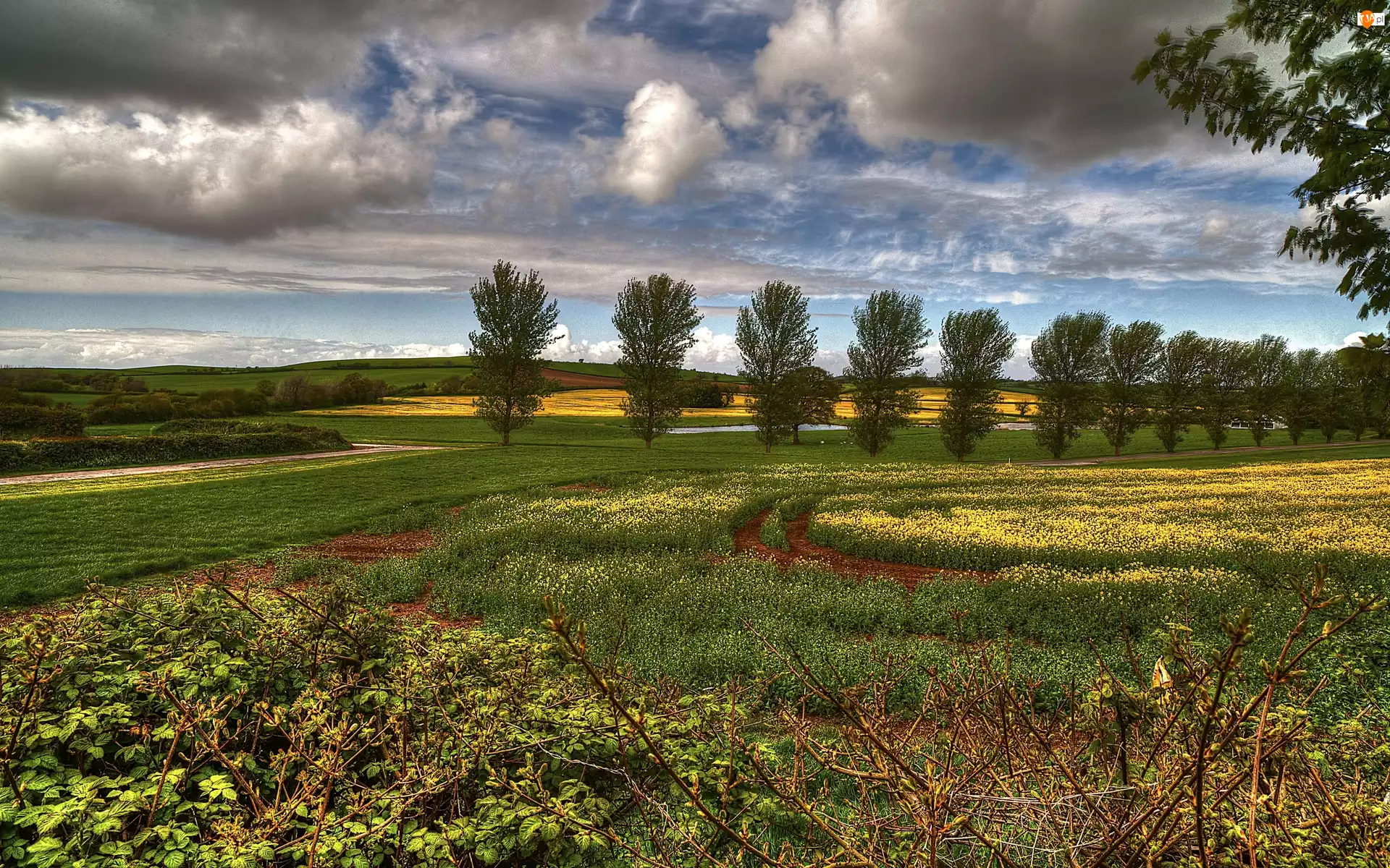 Chmury, Pola, Łąki, Drzewa