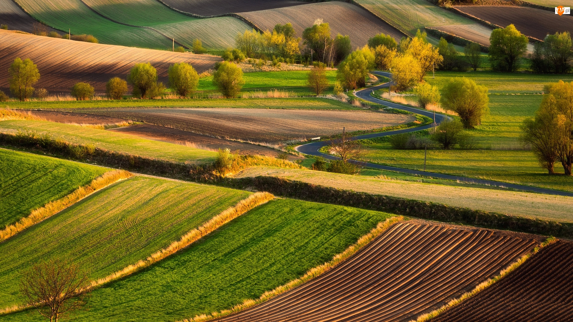 Ponidzie, Pola, Droga, Niecka Nidziańska, Łąki, Wiosna, Polska, Drzewa