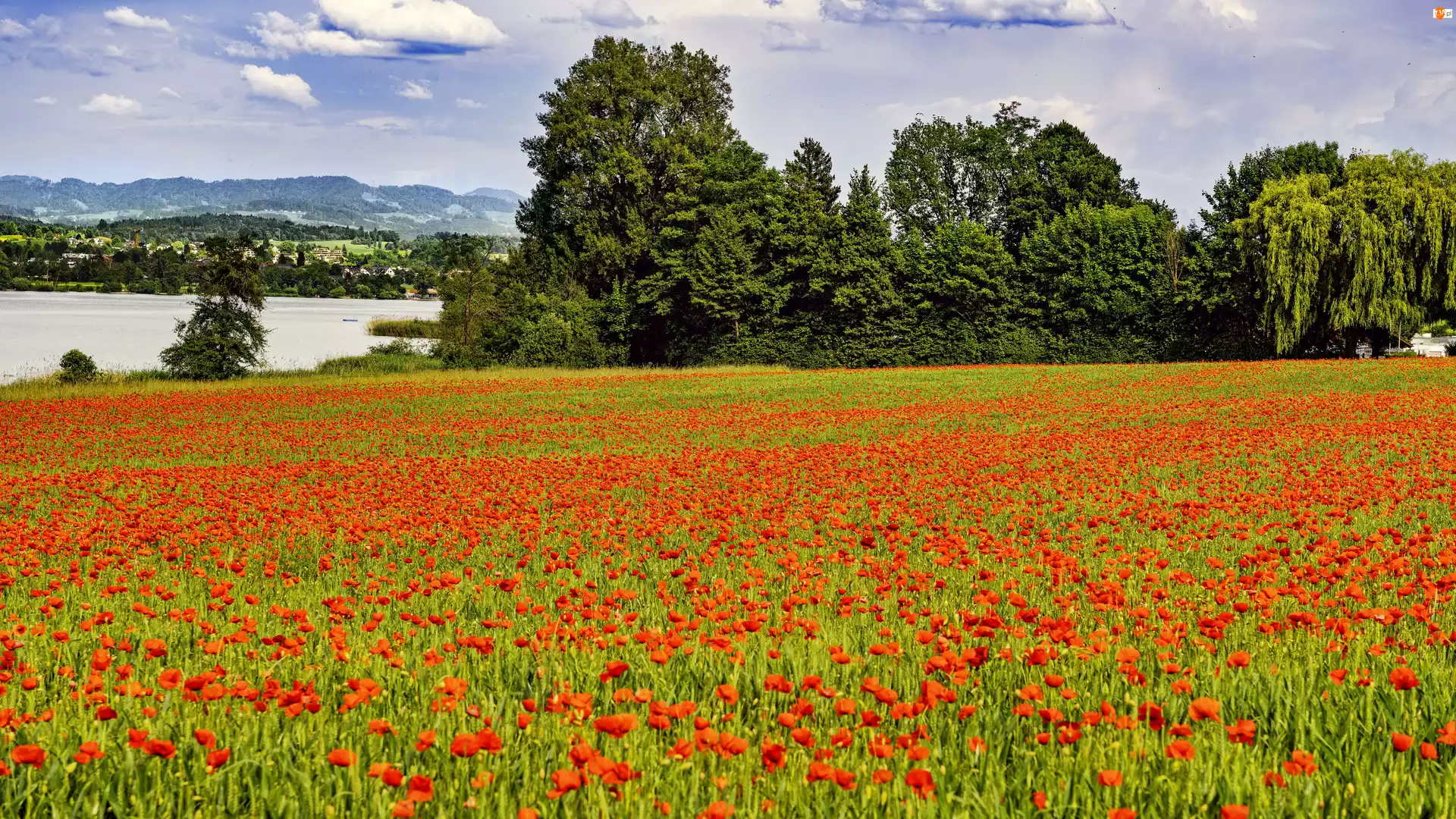 Pole, Krajobraz, Kwiaty, Maki, Drzewa