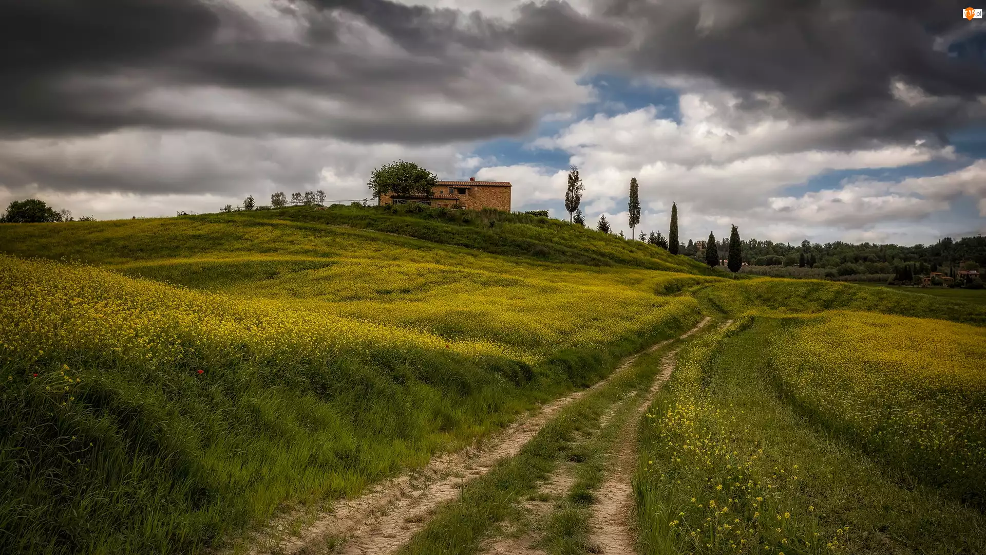 Pole, Ścieżka, Chmury, Niebo, Domy