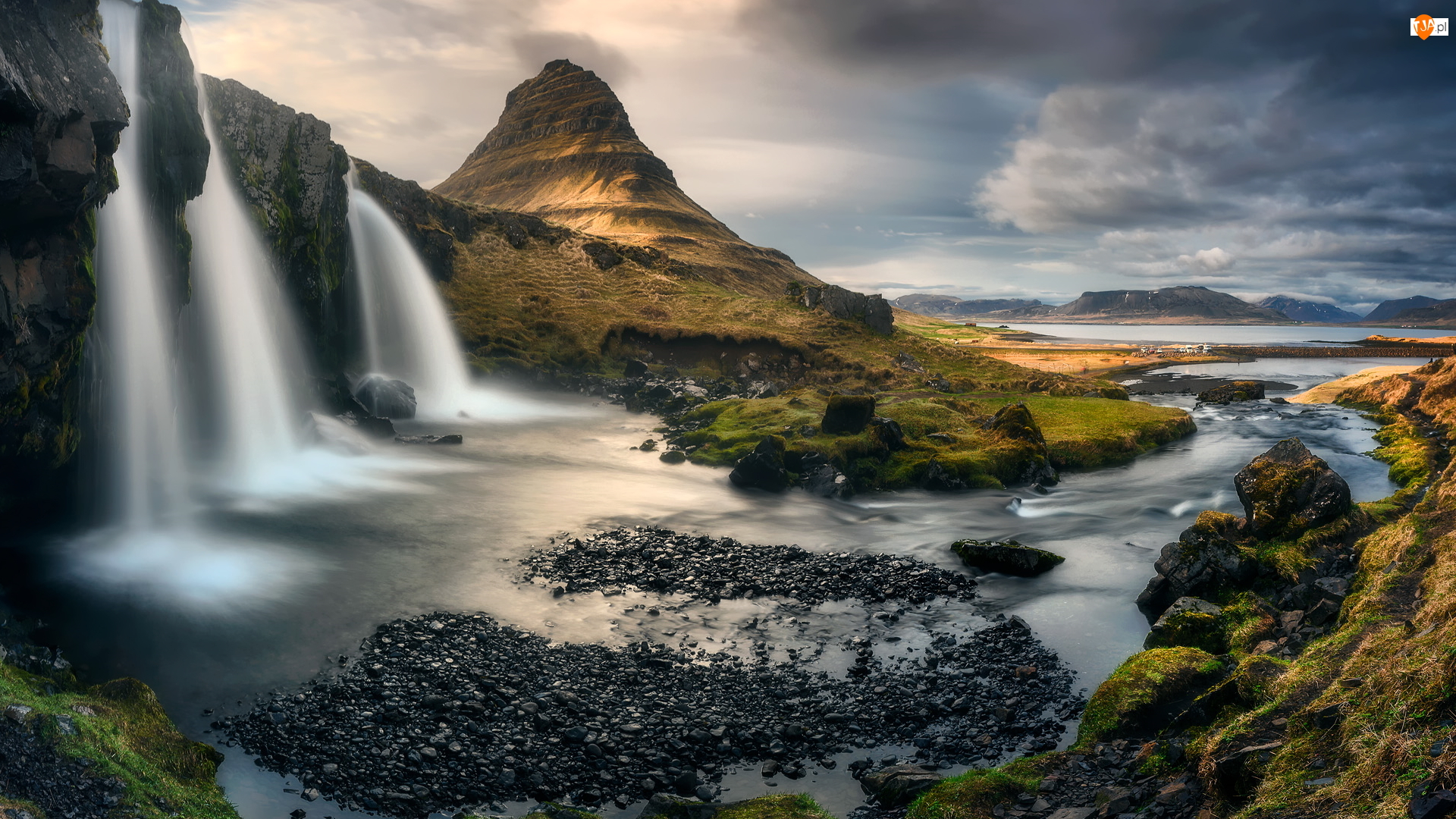 Półwysep Snaefellsnes, Islandia, Wodospad Kirkjufellsfoss, Chmury, Góra Kirkjufell, Rzeka