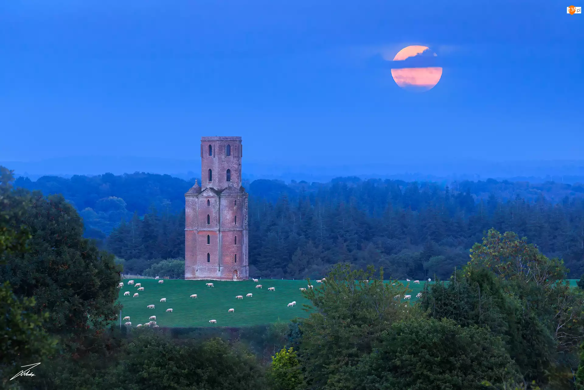 Pomnik, Las, Pastwisko, Drzewa, Dorset, Owce, Horton Tower, Anglia, Łąki, Wimborne, Księżyc