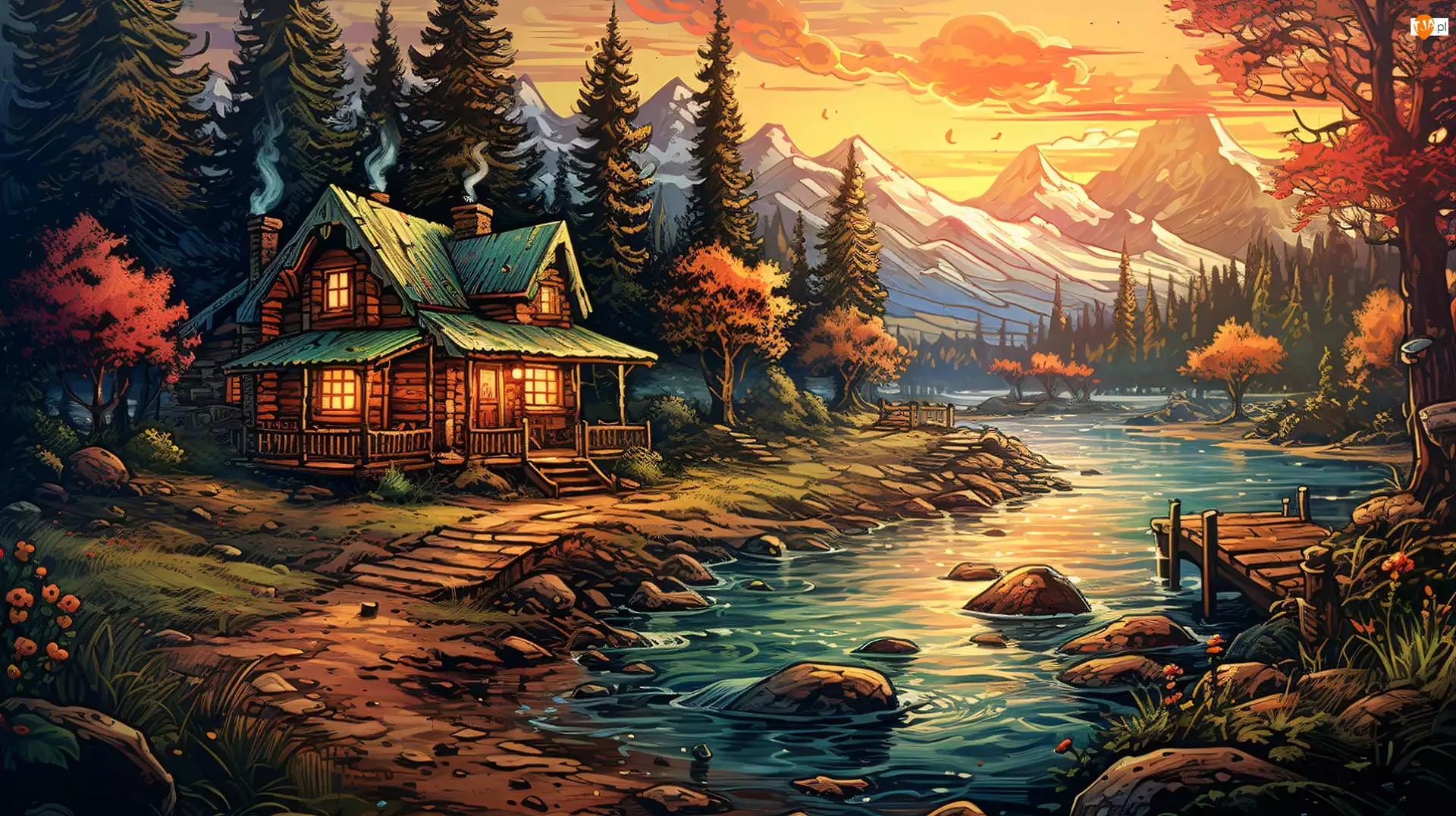 Pomost, Las, Kamienie, Grafika, Rośliny, Góry, Oświetlony, Rzeka, Drzewa, Dom, Ścieżka, Kwiaty
