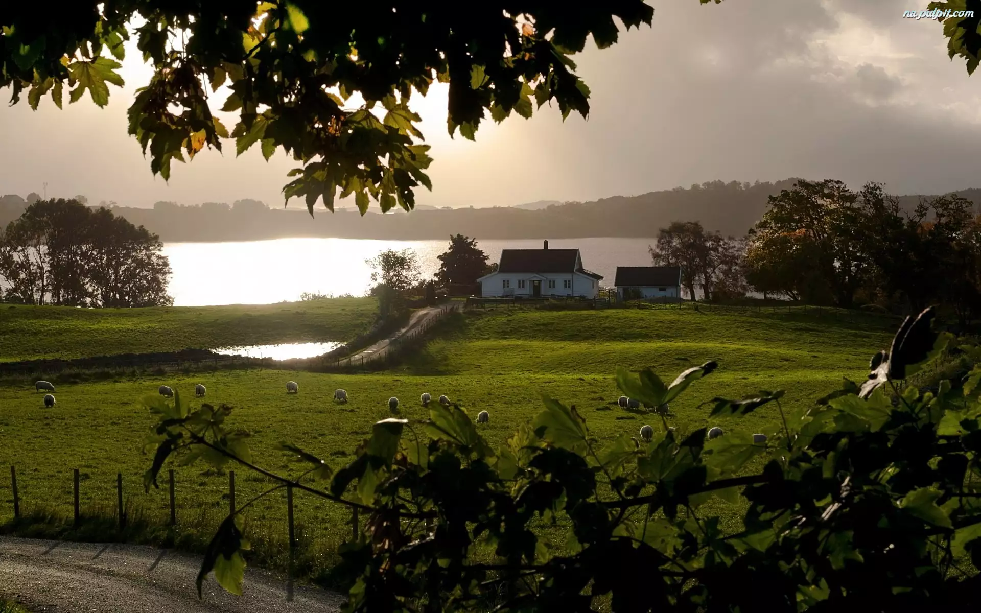 Poranek, Dom, Łąka, Jezioro, Mgła