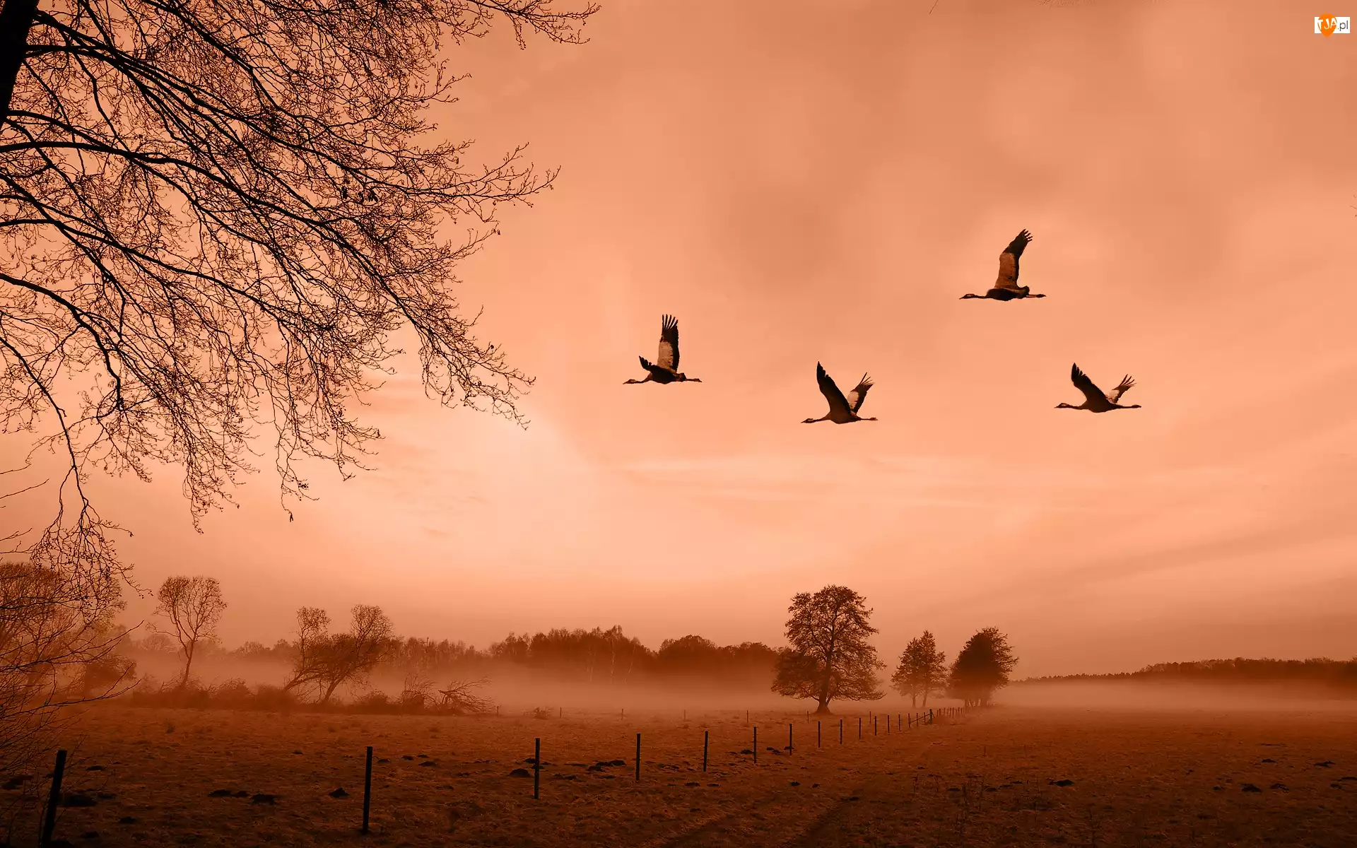 Poranek, Ptaki, Drzewa, Niebo, Mgła