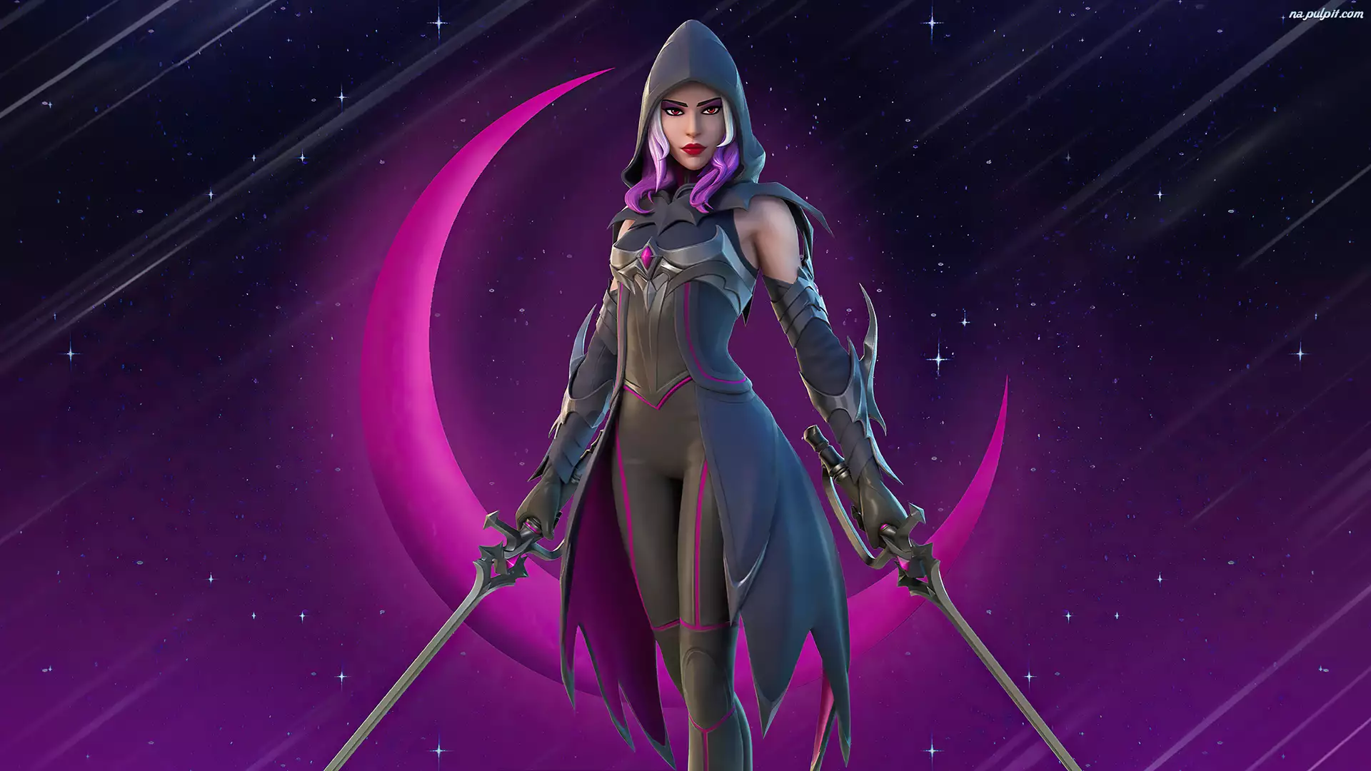 Księżyc, Fortnite, Kaptur, Kobieta, Miecze, Night Hunter, Nocny Łowca, Gra, Postać