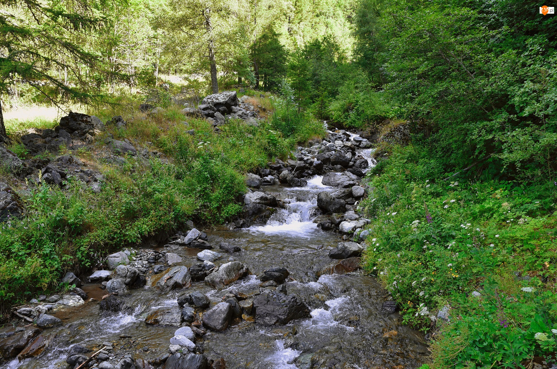 Kamienie, Krzewy, Rzeka, Strumień, Drzewa