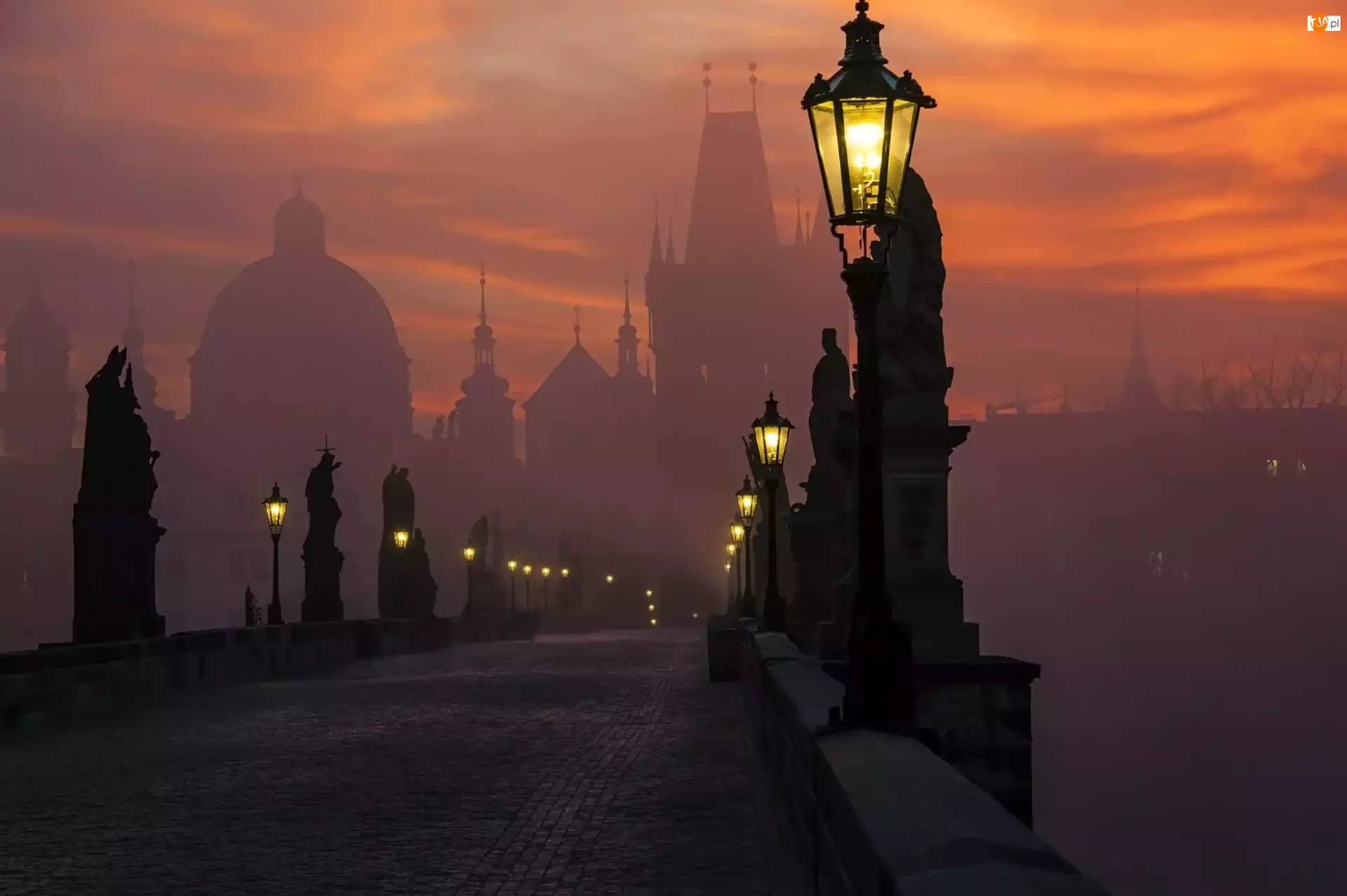 Praga, Mgła, Most Karola, Chmury, Czechy
