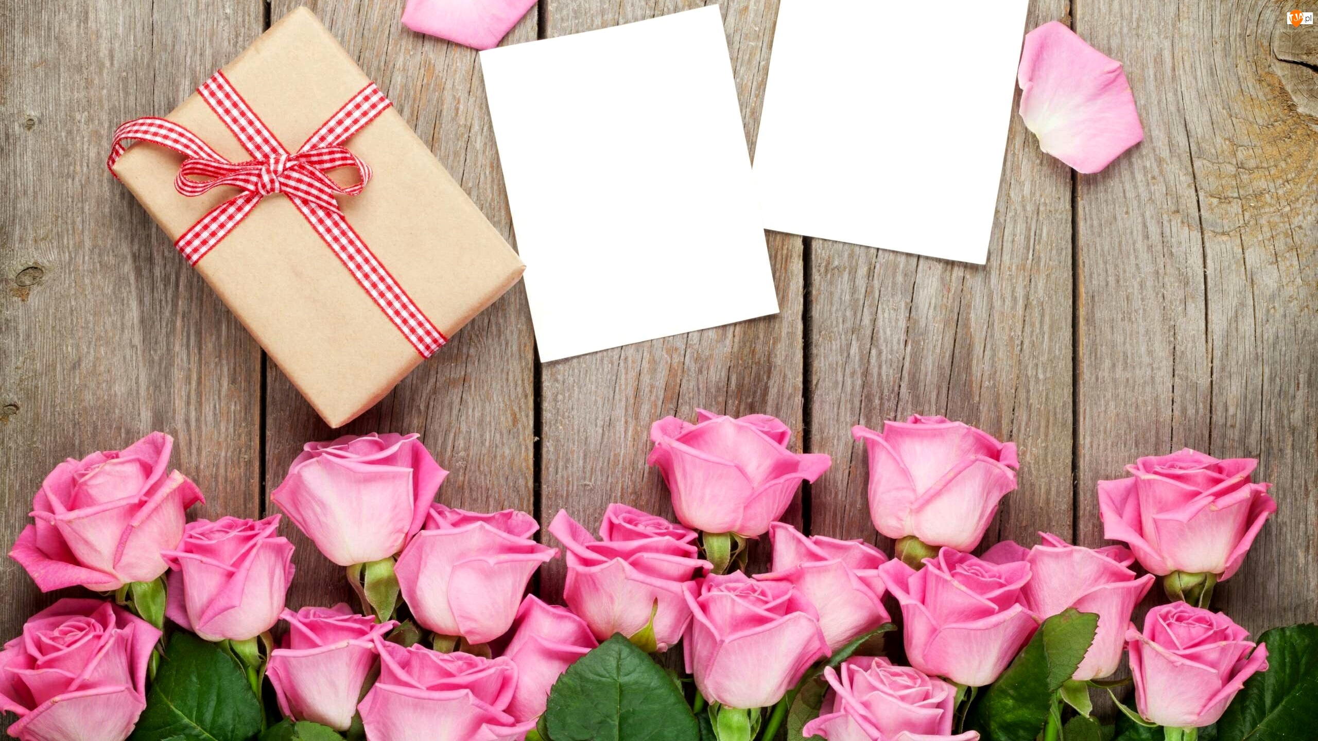 Prezent i białe kartki obok różowych róż na d