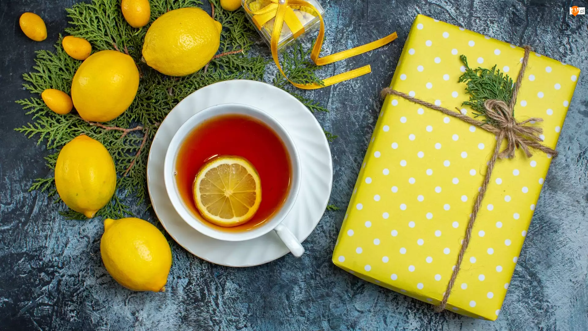 Prezent obok herbaty i cytryn na gałązkach