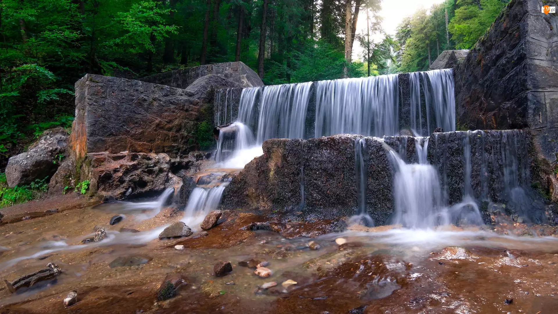Próg rzeczny, Drzewa, Mur, Wodospad, Rzeka