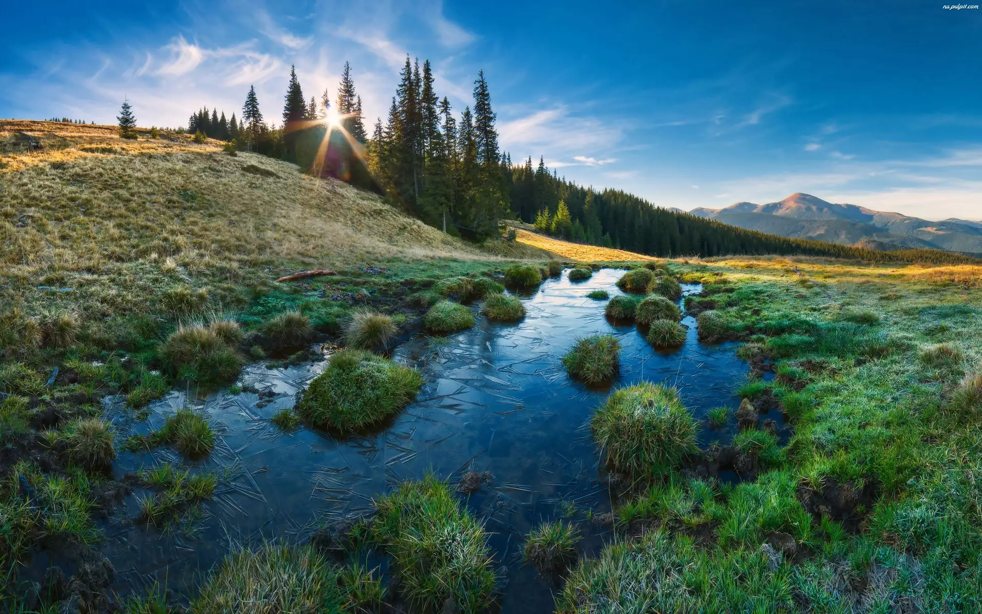 Promienie, Kępy, Wzgórza, Trawy, Rzeka, Słońca