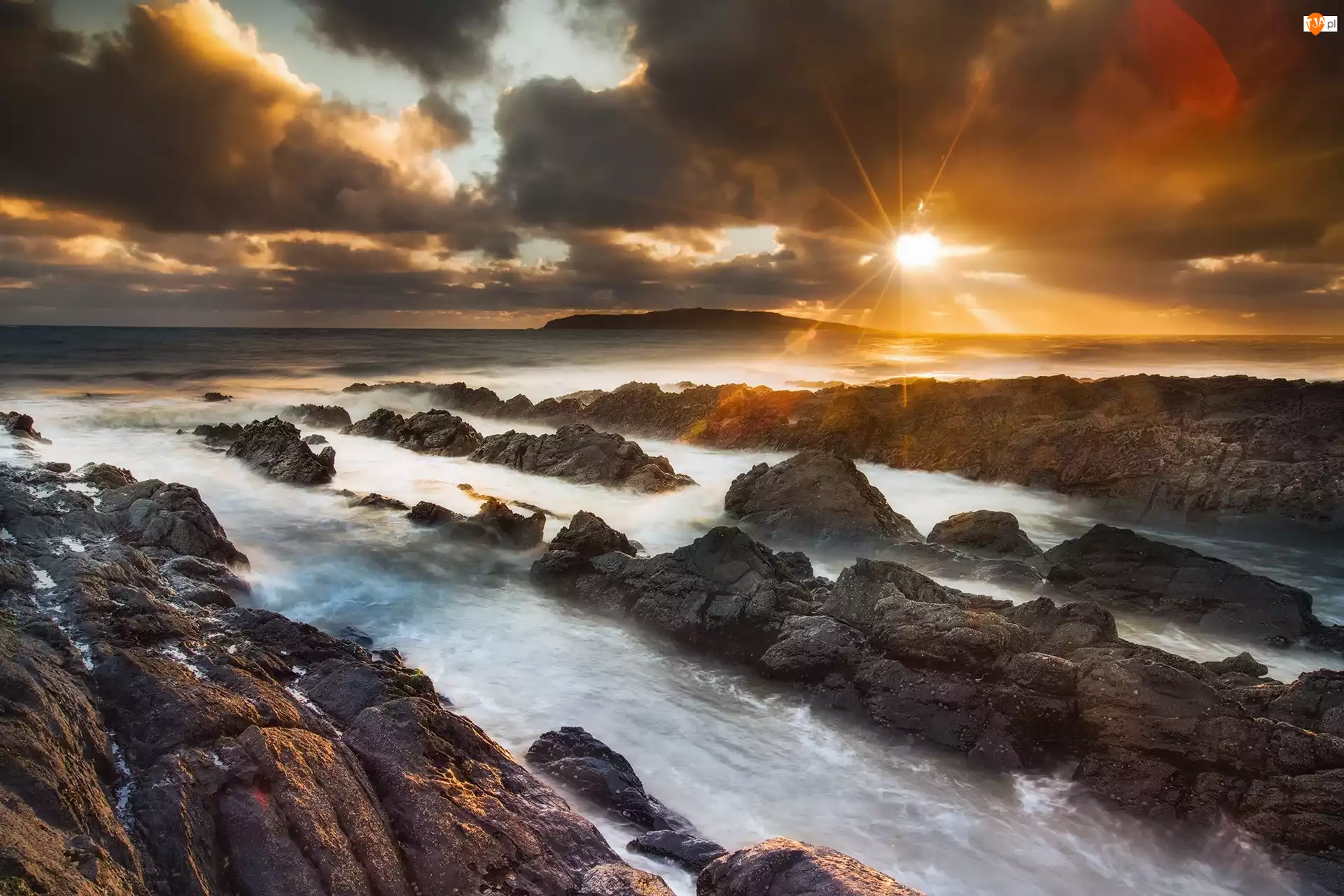 Promienie słońca, Morze, Zachód słońca, Skały, Chmury