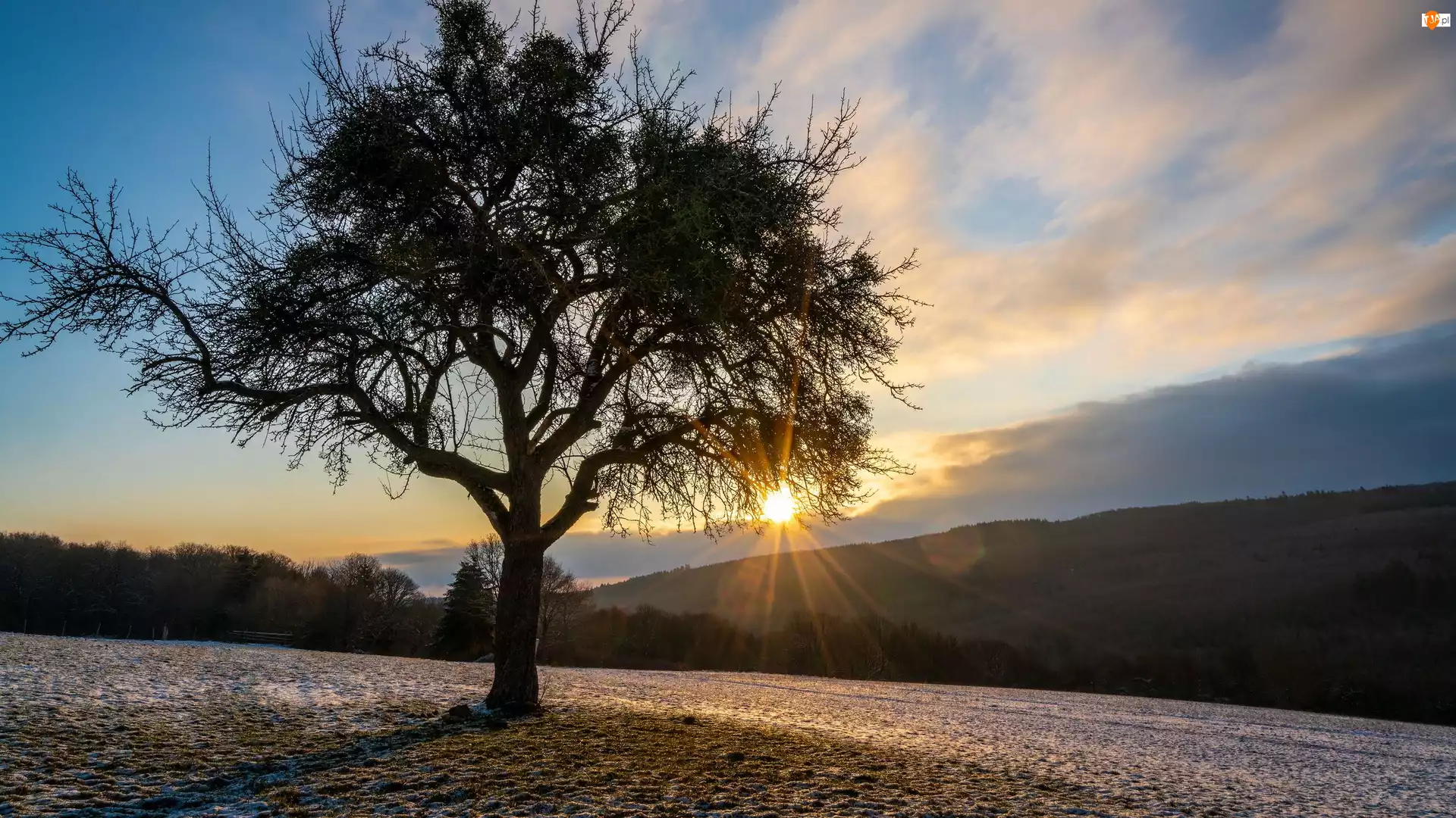 Promienie, Wschód słońca, Słońce, Drzewo, Nie
