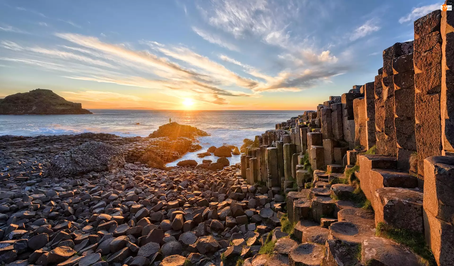 Wschód słońca, Morze, Grobla Olbrzyma, Antrim, Skały, Kamienie, Irlandia Północna, Formacja Giants Causeway