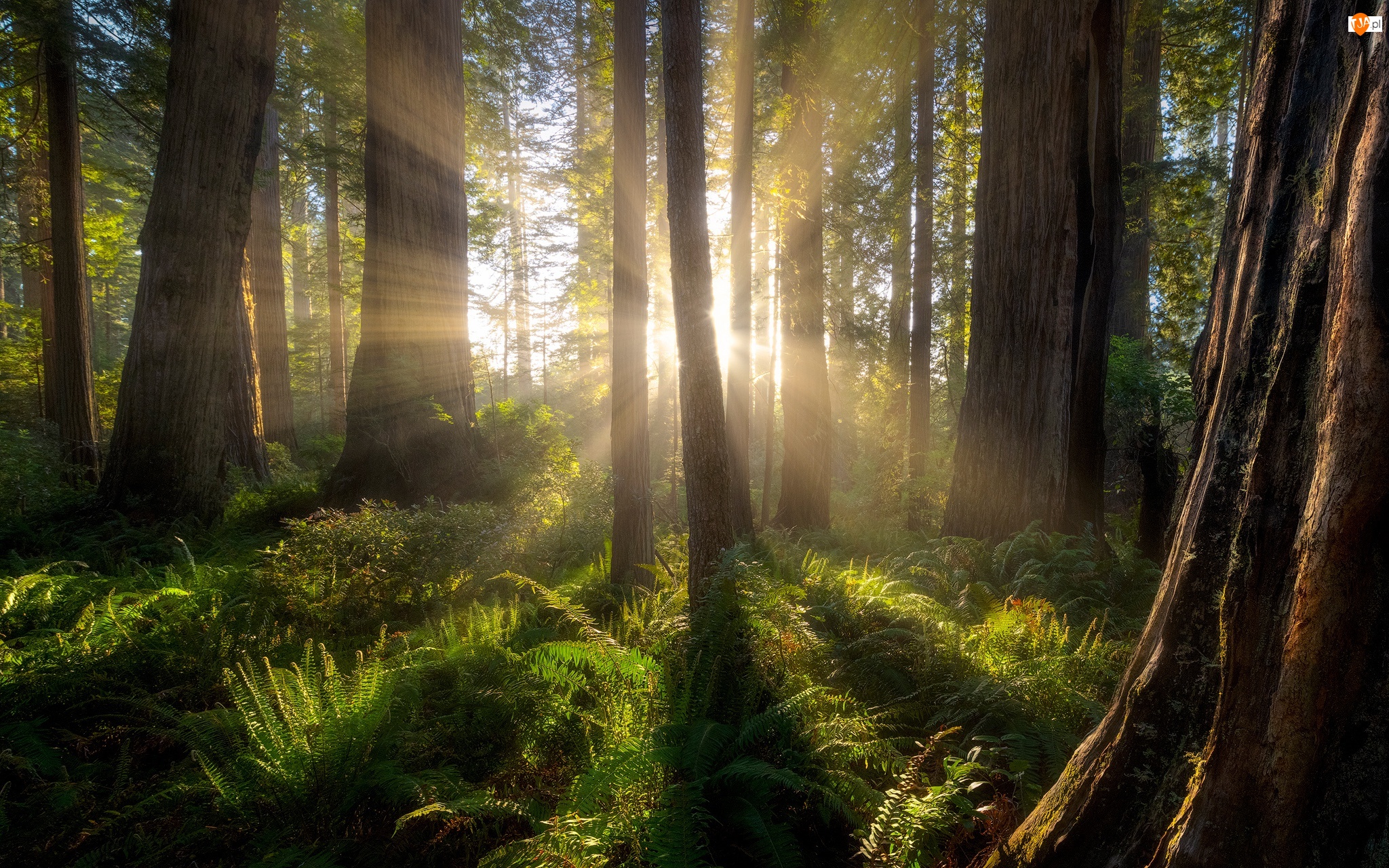 Przebijające światło, Las, Drzewa, Paprocie
