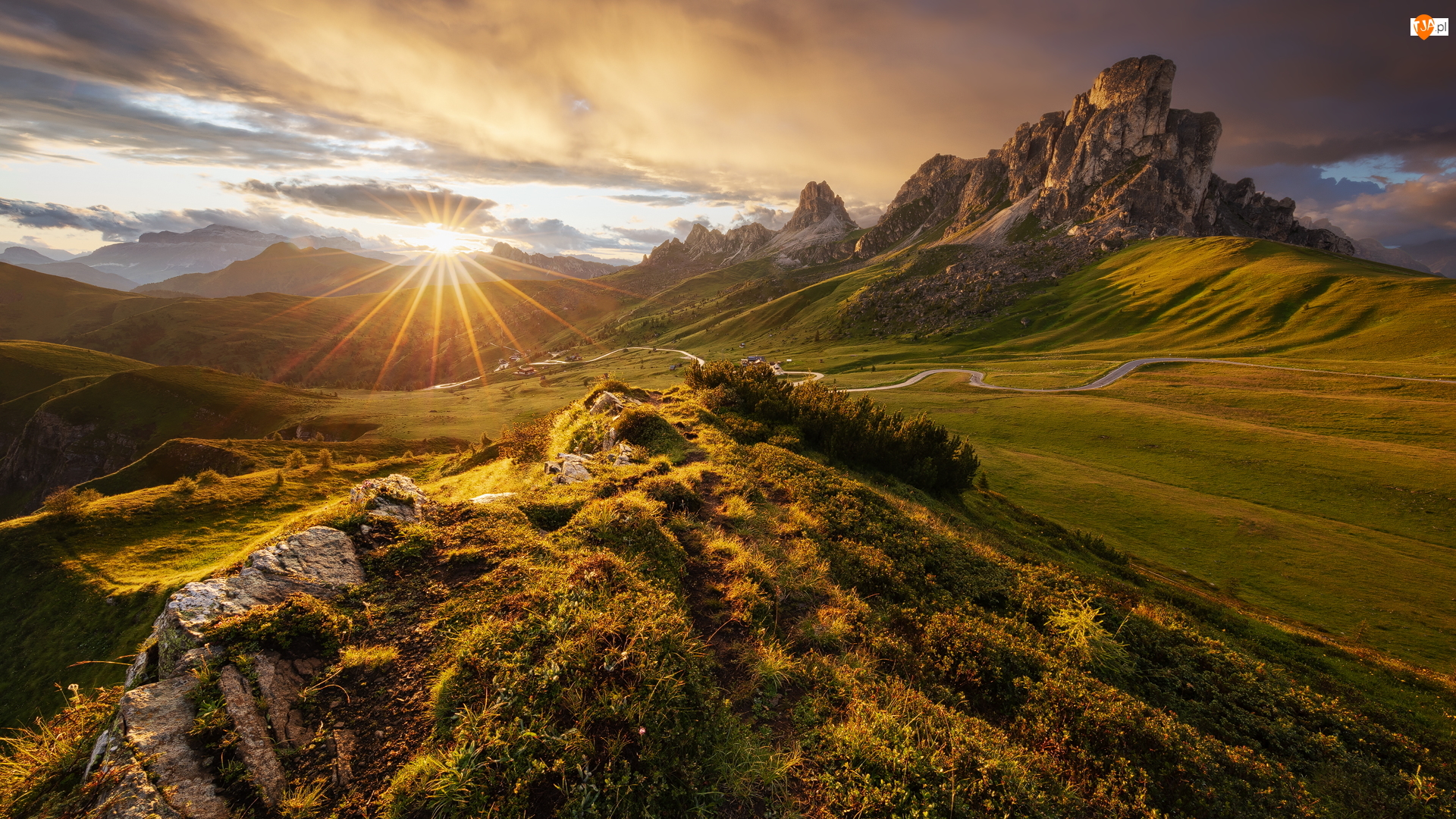 Włochy, Dolomity, Skała, Zachód słońca, Droga, Góra Ra Gusela, Przełęcz Giau Pass, Góry, Promienie słońca
