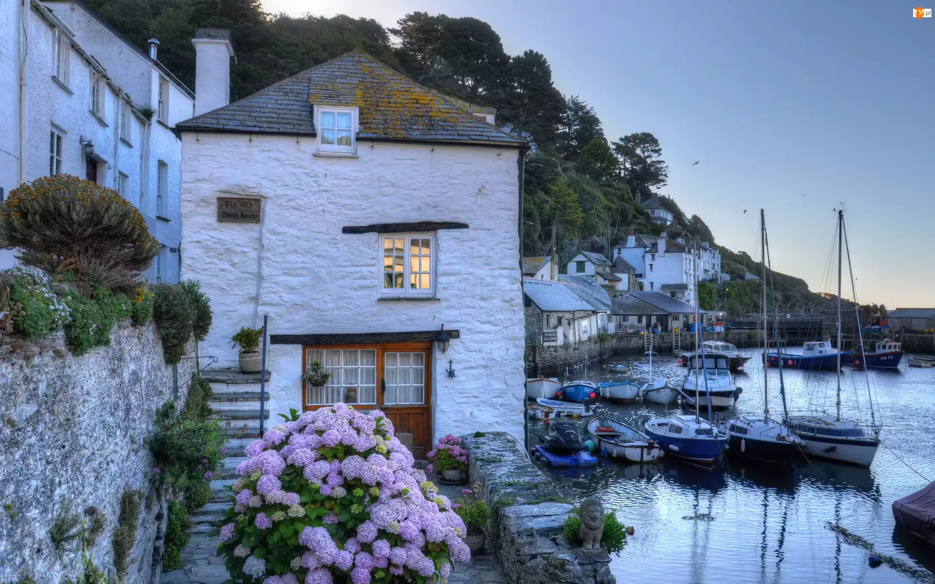 Przystań, Łódki, Anglia, Domy, Polperro, Drzewa, Hortensja