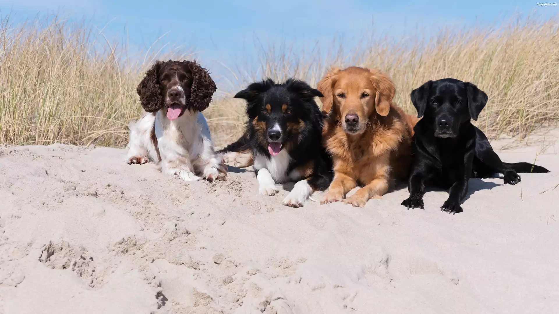Trawa, Psy, Piasek, Labrador retriever, Plaża, Spaniel angielski, Border collie, Cztery, Golden retriever