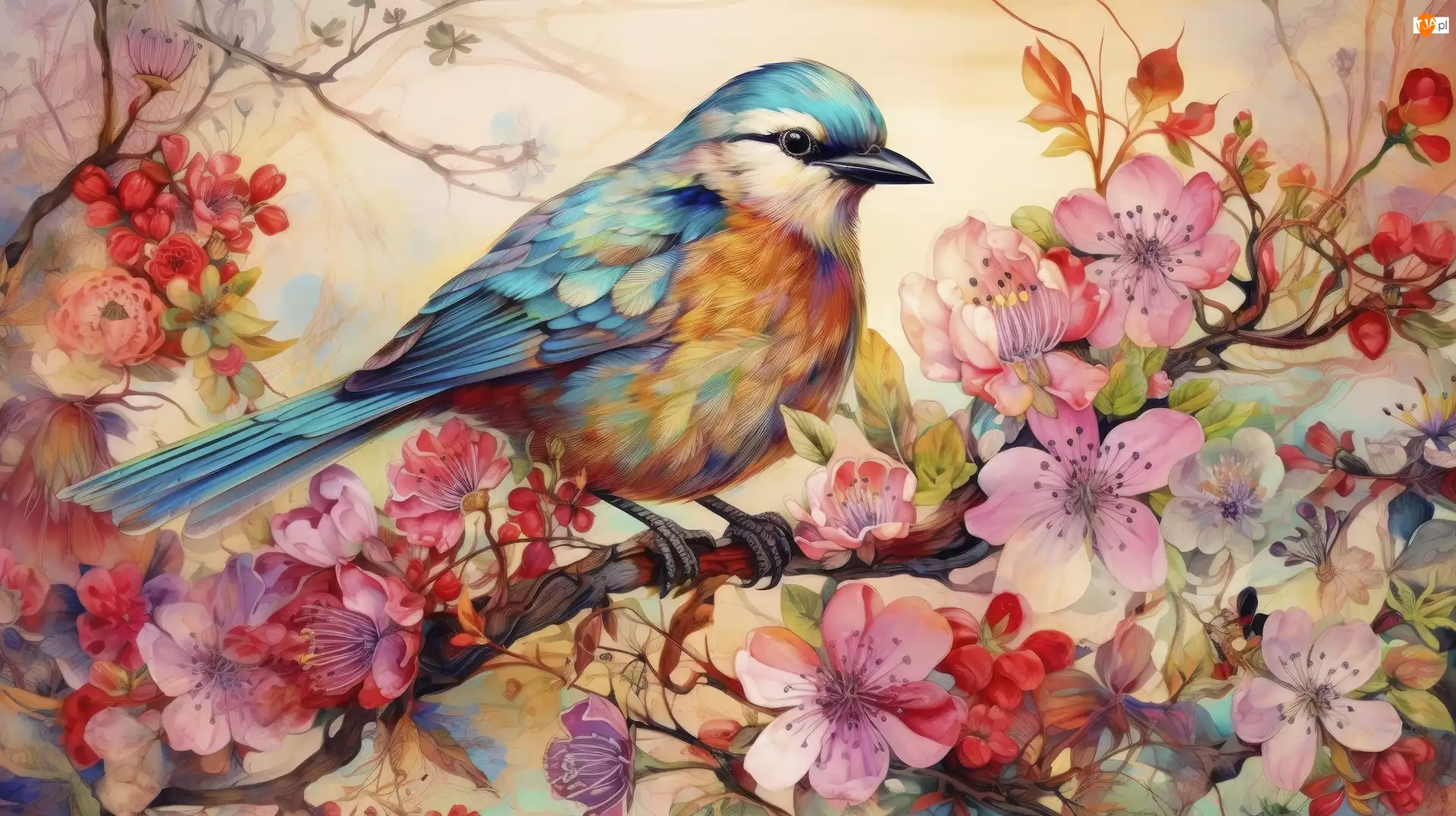Gałązka, Kolorowe, Ptak, Grafika, Kwiaty