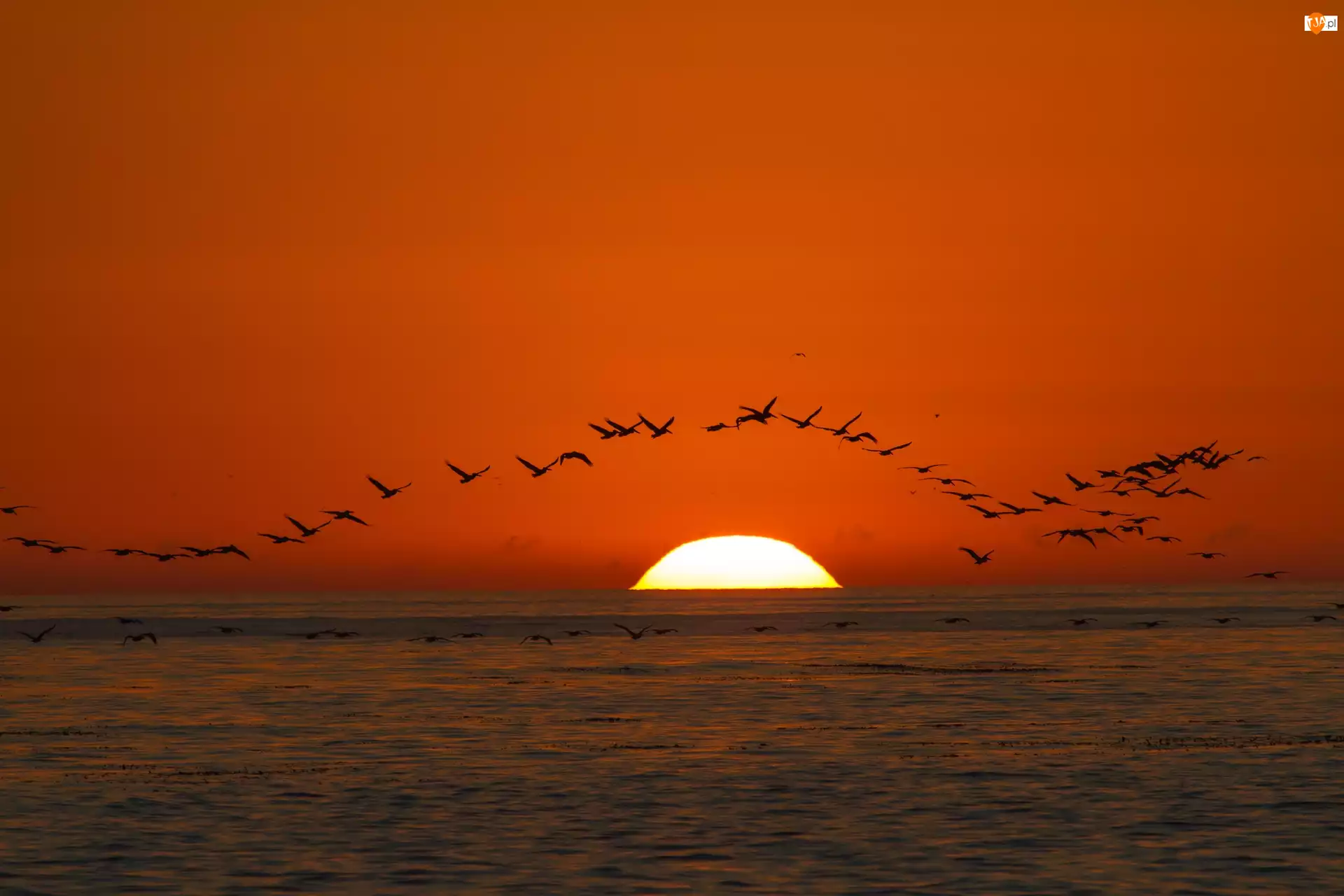 Ptaki, Morze, Zachód, Niebo, Słońca