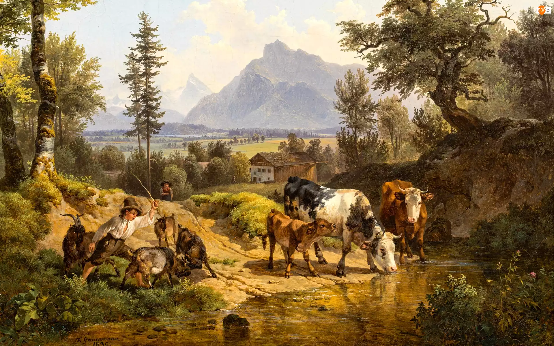 Wieś, Drzewa, Kozy, Dom, Friedrich Gauermann, Reprodukcja obrazu, Góry, Rzeka, Chłopiec, Krowy