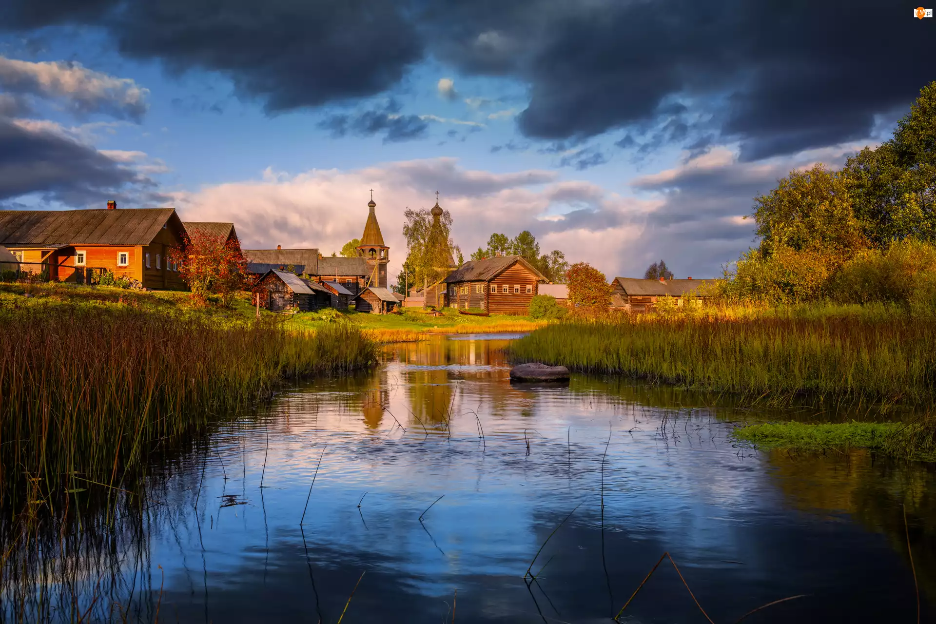 Rosja, Domy, Chmury, Cerkiew, Jezioro, Wschód słońca, Drzewa, Trzciny, Wieś, Obwód archangielski