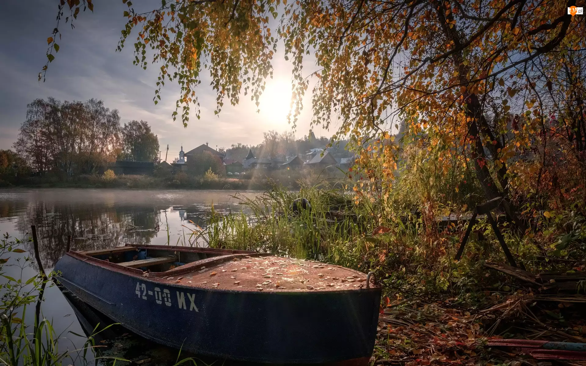 Rosja, Drzewa, Obwód iwanowski, Szochonka, Plos, Łódka, Domy, Jesień, Rzeka