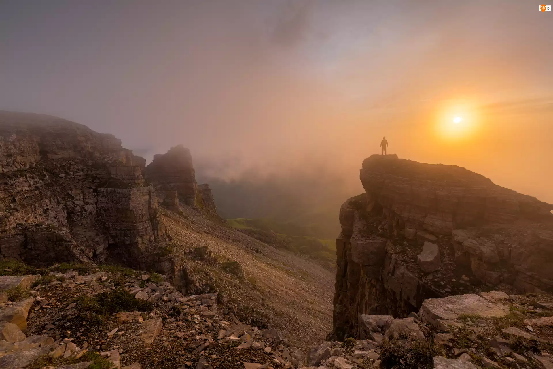 Rosja, Kaukaz, Republika Karaczajo-Czerkiesja, Promienie słońca, Płaskowyż Bermamyt, Skały, Mgła, Góry, Człowiek