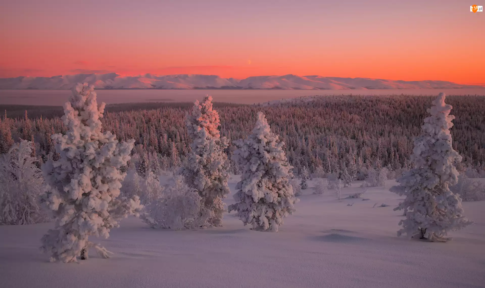 Rosja, Wschód słońca, Półwysep Kolski, Góry, Chibiny, Las, Ośnieżone, Zima, Drzewa