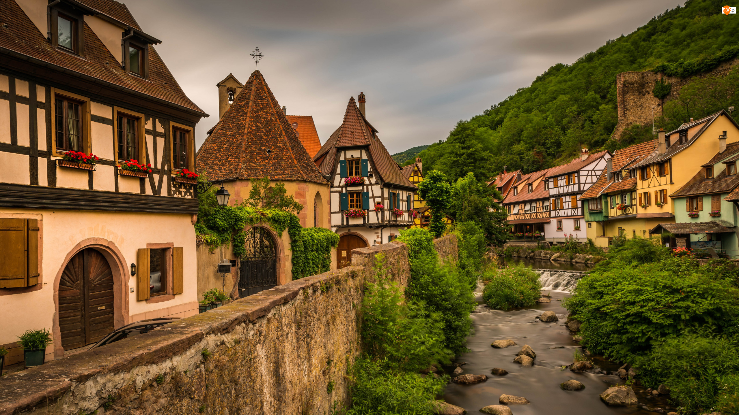 Roślinność, Francja, Domy, Rzeka Weiss, Gmina Kaysersberg