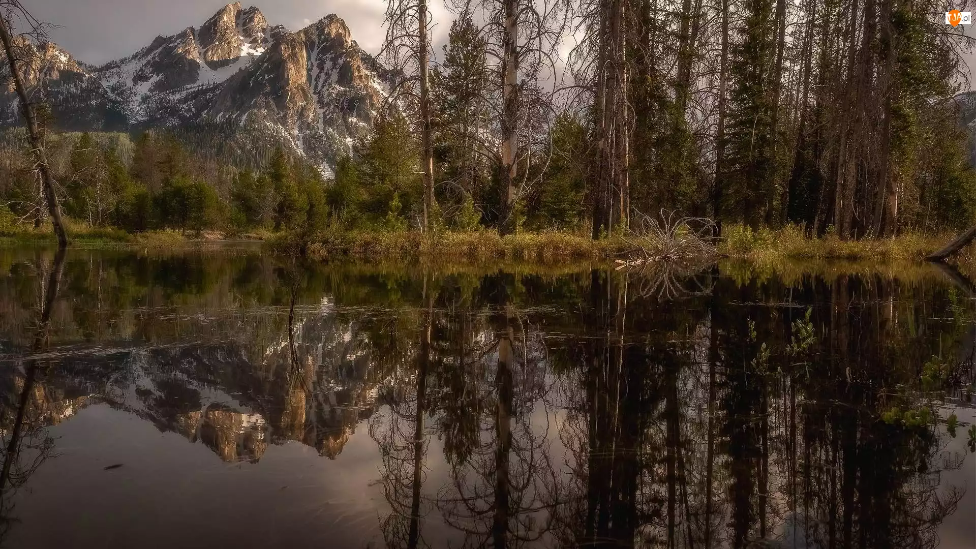 Rośliny, Sawtooth Range, Drzewa, Stany Zjednoczone, Odbicie, Góry, McGown Peak, Stanley Creek, Góra, Potok, Rzeka, Stan Idaho