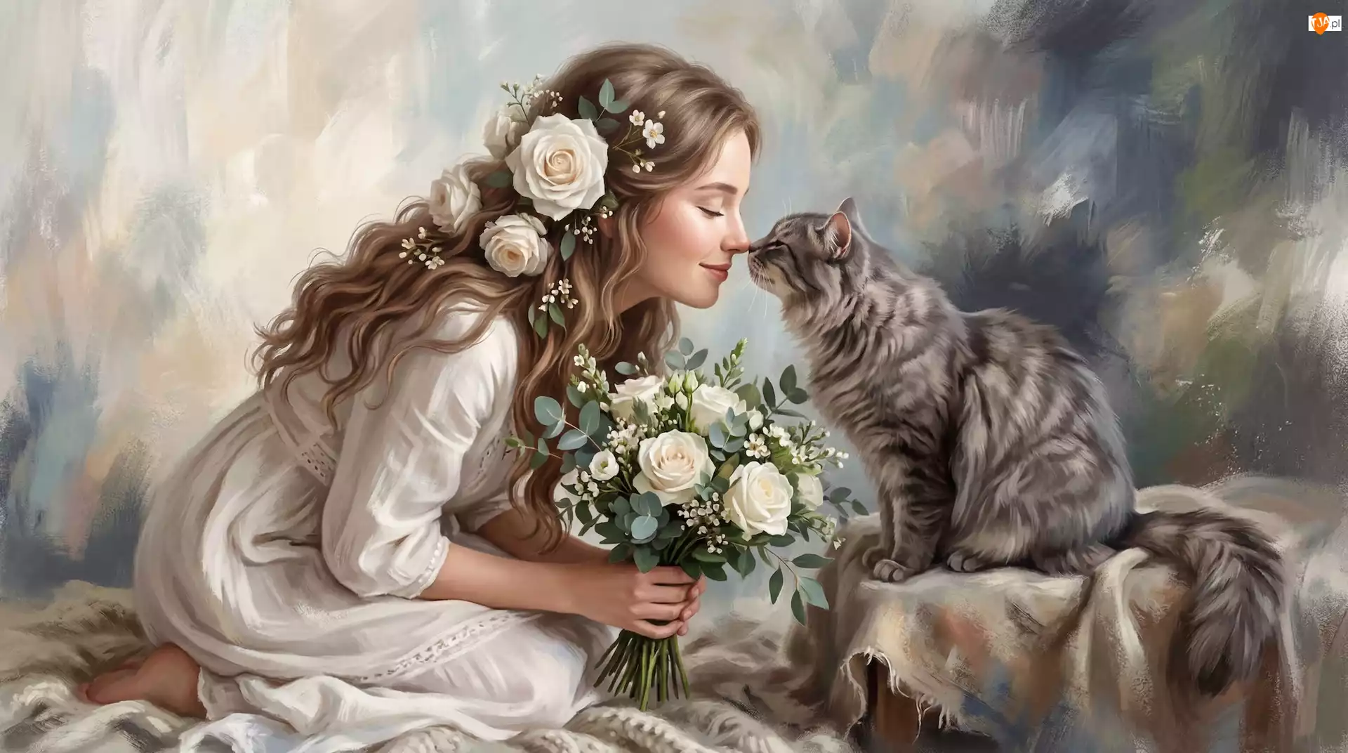 Róże, Grafika, Kwiaty, Dziewczyna, Kot