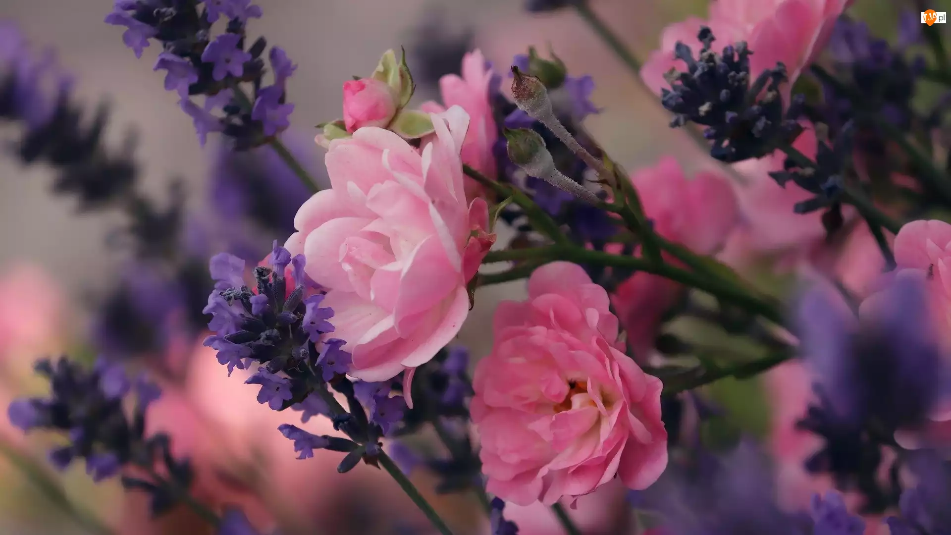 Kwiaty, Róże, Różowe, Fioletowe, Lawenda