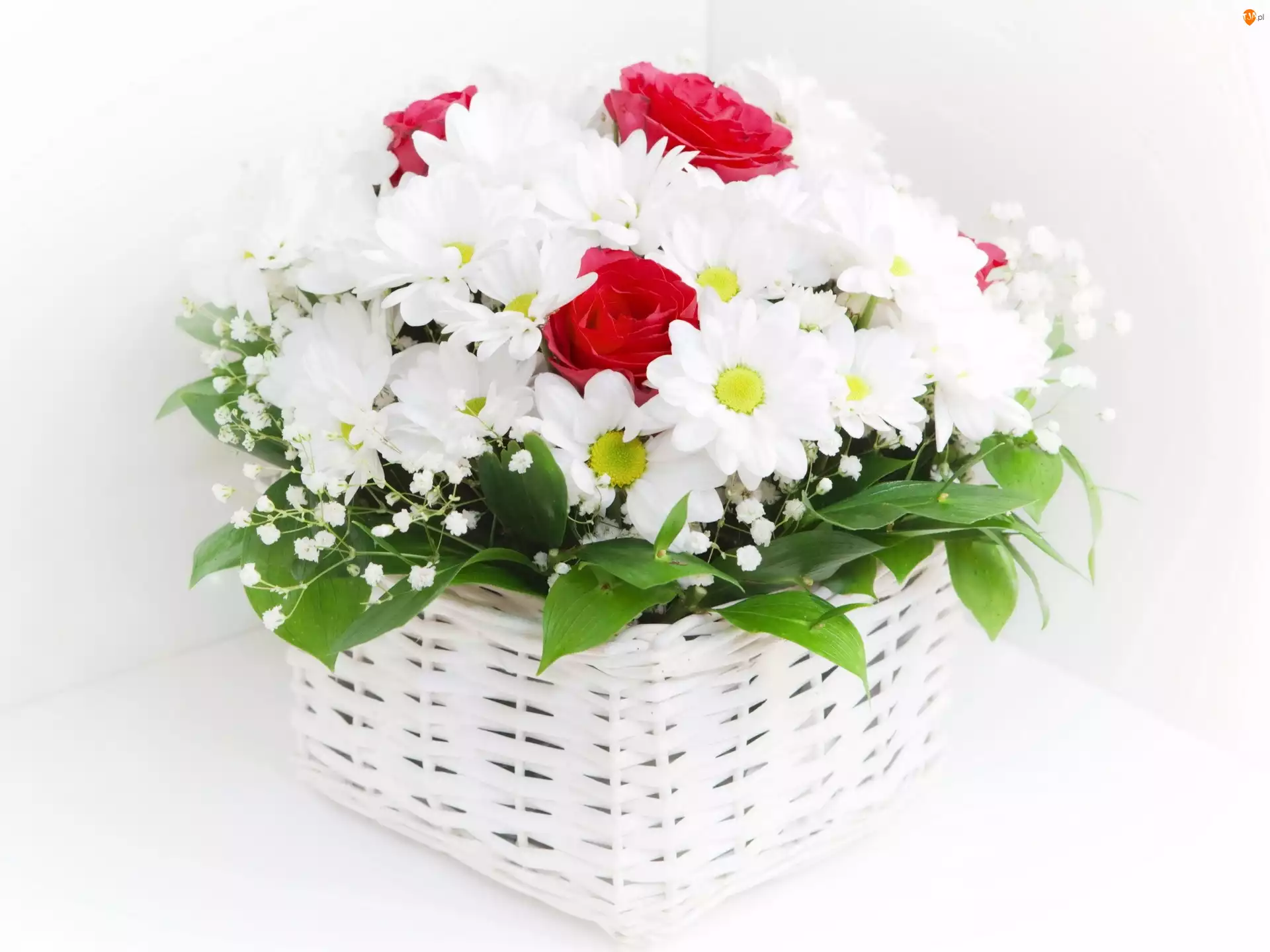Róże, Kosz, Margerytki, Białe, Czerwone