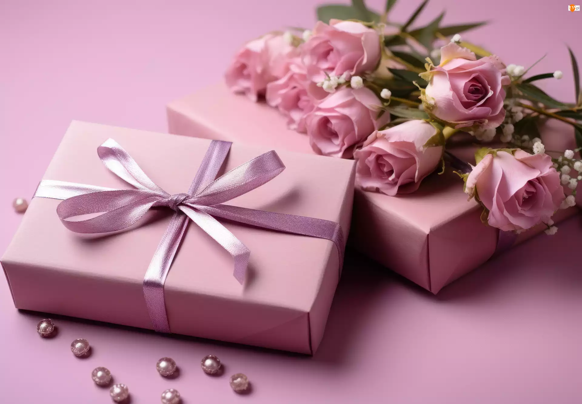 Pudełka, Prezenty, Róże, Dwa, Różowe, Kwiaty, Koraliki