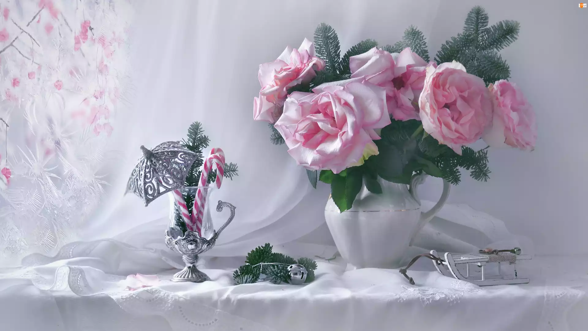 Róże, Szklanka, Różowe, Kompozycja, Saneczki